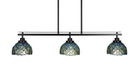 Q: What is the design style of the Odyssey 3 Light Island in Matte Black?A: The Odyssey 3 Light Island features a modern design with a matte black finish and turquoise cypress art glass, making it a stylish addition to contemporary or industrial-themed interiors.