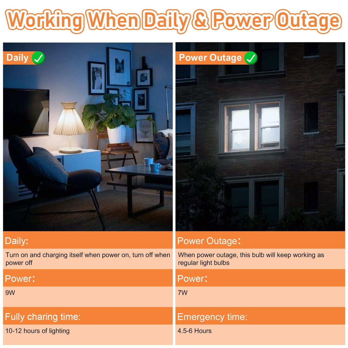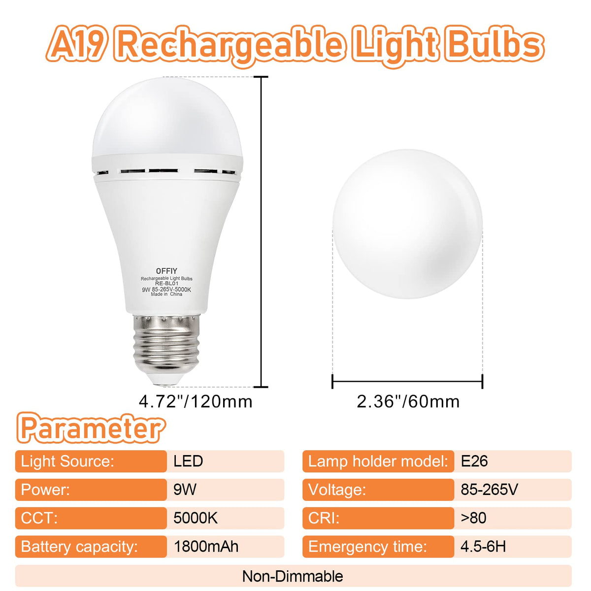 Offliy Emergency Light Bulbs, 1800Mah High-Capacity Battery For Longer Emergency Time, 9W,750Lm,5000K Rechargeable Light Bulbs F