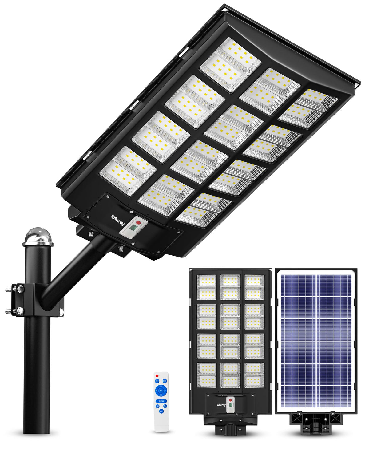 Q: What are the main features of the Ofuray Of-5600W Solar Street Lights?A: The Ofuray Of-5600W Solar Street Lights feature 192 super-bright 5054 high-power LED lamp beads, offering high brightness with low power consumption. They include three modes: Dusk to Dawn, Motion Sensor, and Intelligent Control, allowing for customizable brightness settings. Additionally, they are equipped with a remote control for convenient operation.