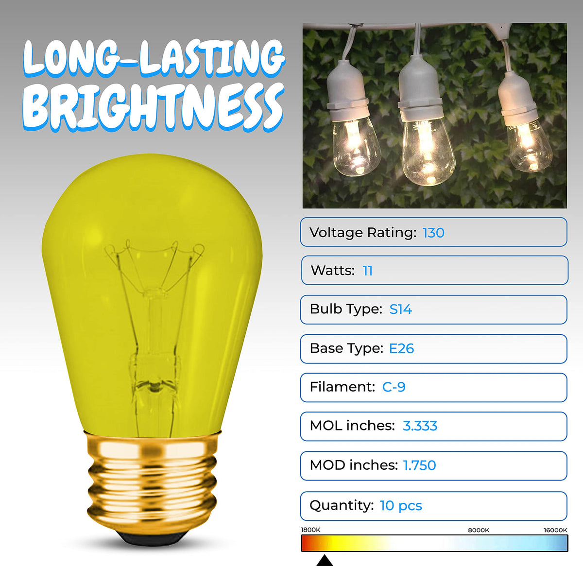 Ohlectric S14 Transparent Yellow String Light Bulbs | 11 Watts Dimmable Led Bulbs With E26 Base, 5000 Hours Of Light | Pack Of 10
