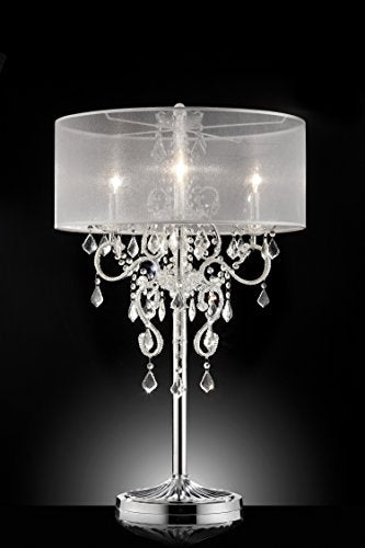 Q: What materials are used in the construction of this table lamp?A: This elegant table lamp features a polished chrome base and is adorned with luxurious crystal elements, along with a shimmery white drum shade.