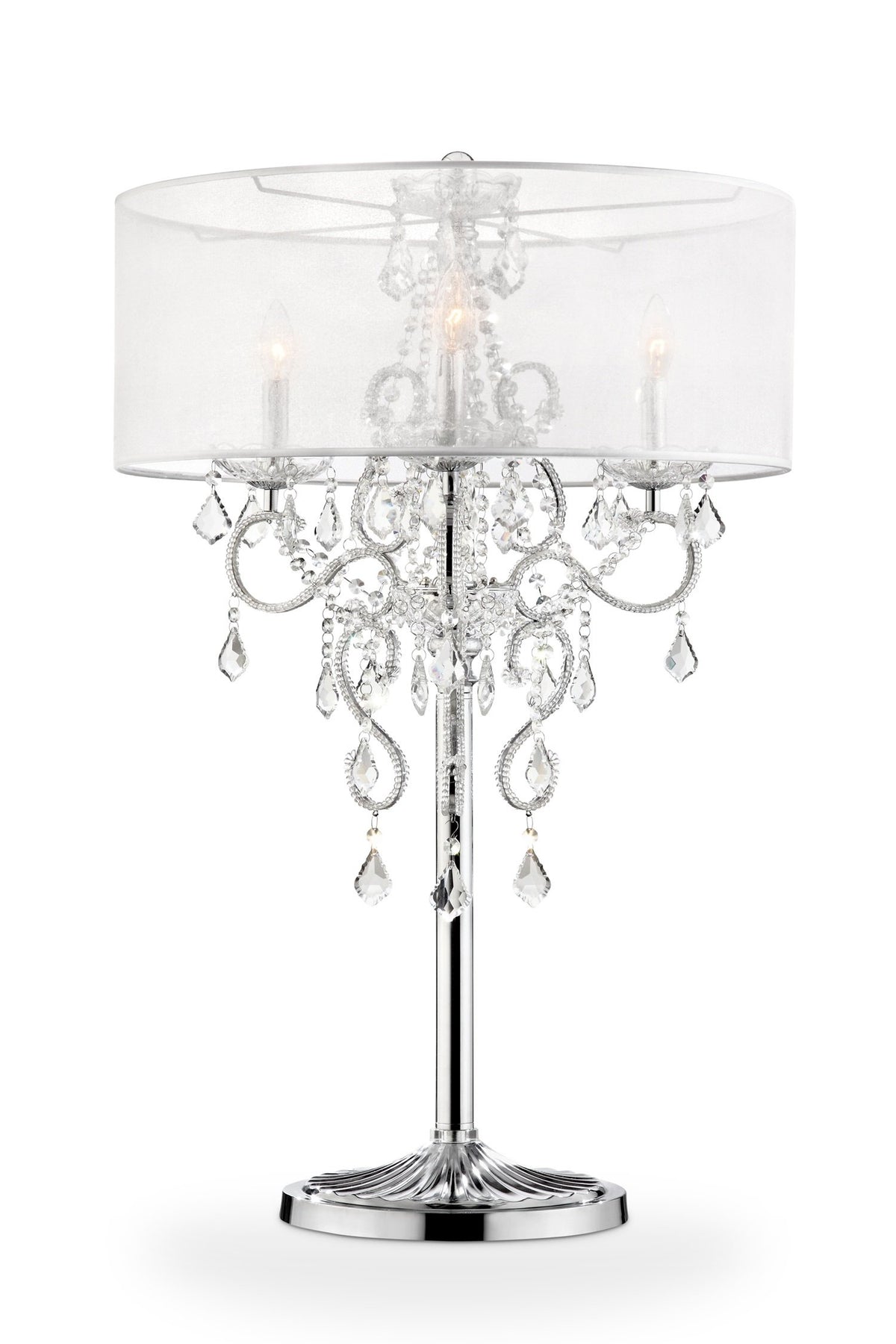 This grand crystal silver table lamp makes an elegant addition to a traditional-style home. Featuring a sheer white ivory drum shade, polished metal base, and dangling crystal Charms, intricately beaded arms, this lamp has a sophisticated, luxe feel. Display it on a console or side table. Ul listed