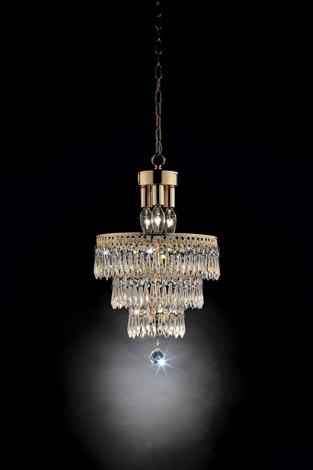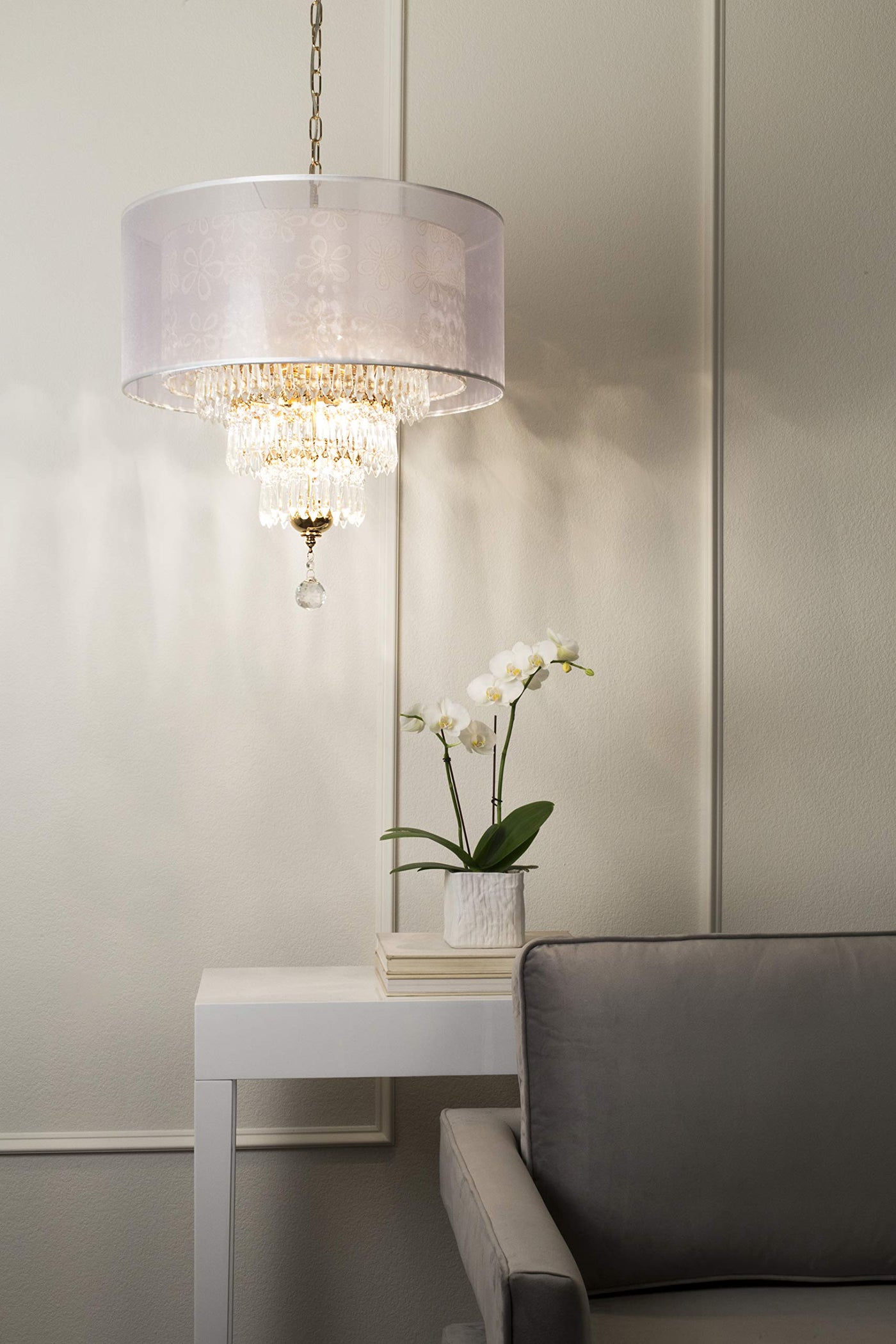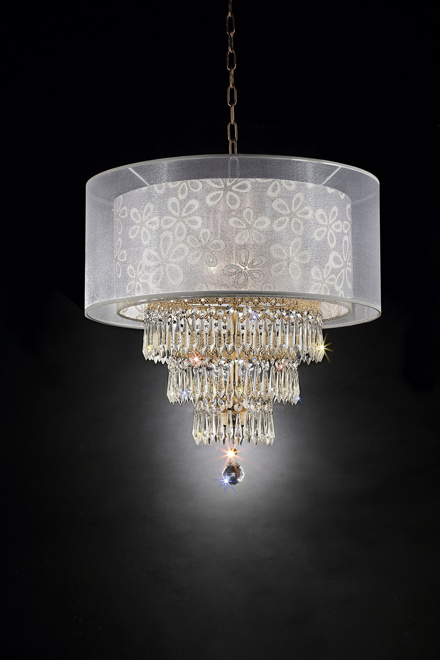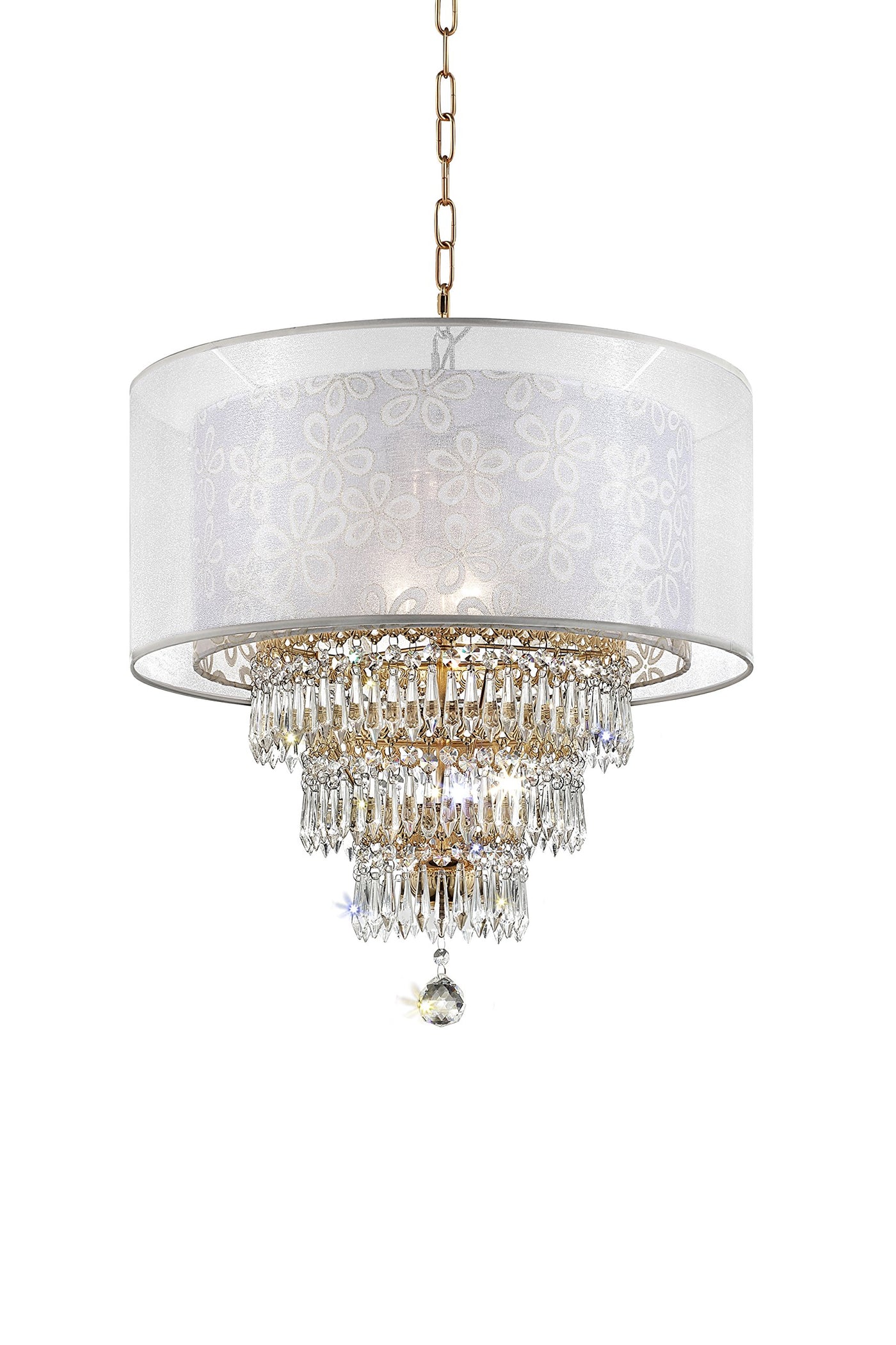 This beautiful ceiling lamp will illuminate any room or living space. Featuring a double-shimmering translucent outer shade lined with a satin finish and a floral-patterned inner shade delicately outlined with a gold finish. It has three cascading rows of crystal droplets dangling off intricately pattered gold rings. Perfect for hanging in an entryway hall, dining area, or any room.