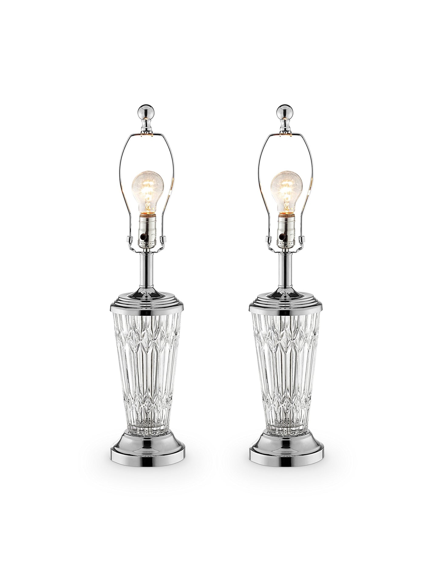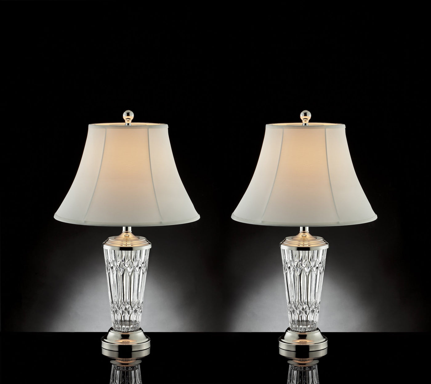 Brighten your living space and accentuate your interior d cor style with this pair of sophisticated table lamps. The distinct design features a trumpet-shaped glass base with a detailed pattern and a polished nickel finish. Topped with a bell-shaped, off-white, fabric lamp shade. These lamps are an elegant addition to any living room, den, home office, or other living space.