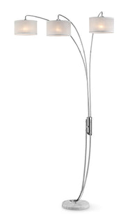 Simple and modern arch lamp with three arms, each with a translucent cream colored drum shade. The body is polished chrome met by a sturdy marble base. The rotary on/off switch allows the lamp to have different light settings. This lamp is perfect for a living or bed room and will bring in many compliments.