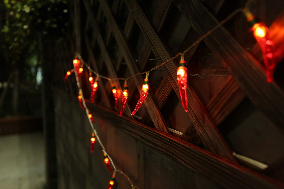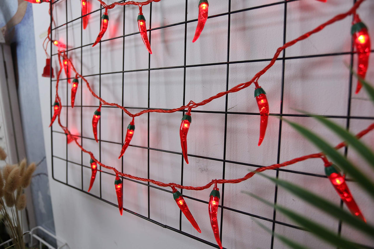 Q: What material are the Chili Pepper String Lights made from?A: The string lights are made from a durable fabric material with a clear plastic cable, ensuring flexibility in shaping and design while being lightweight and easy to handle.