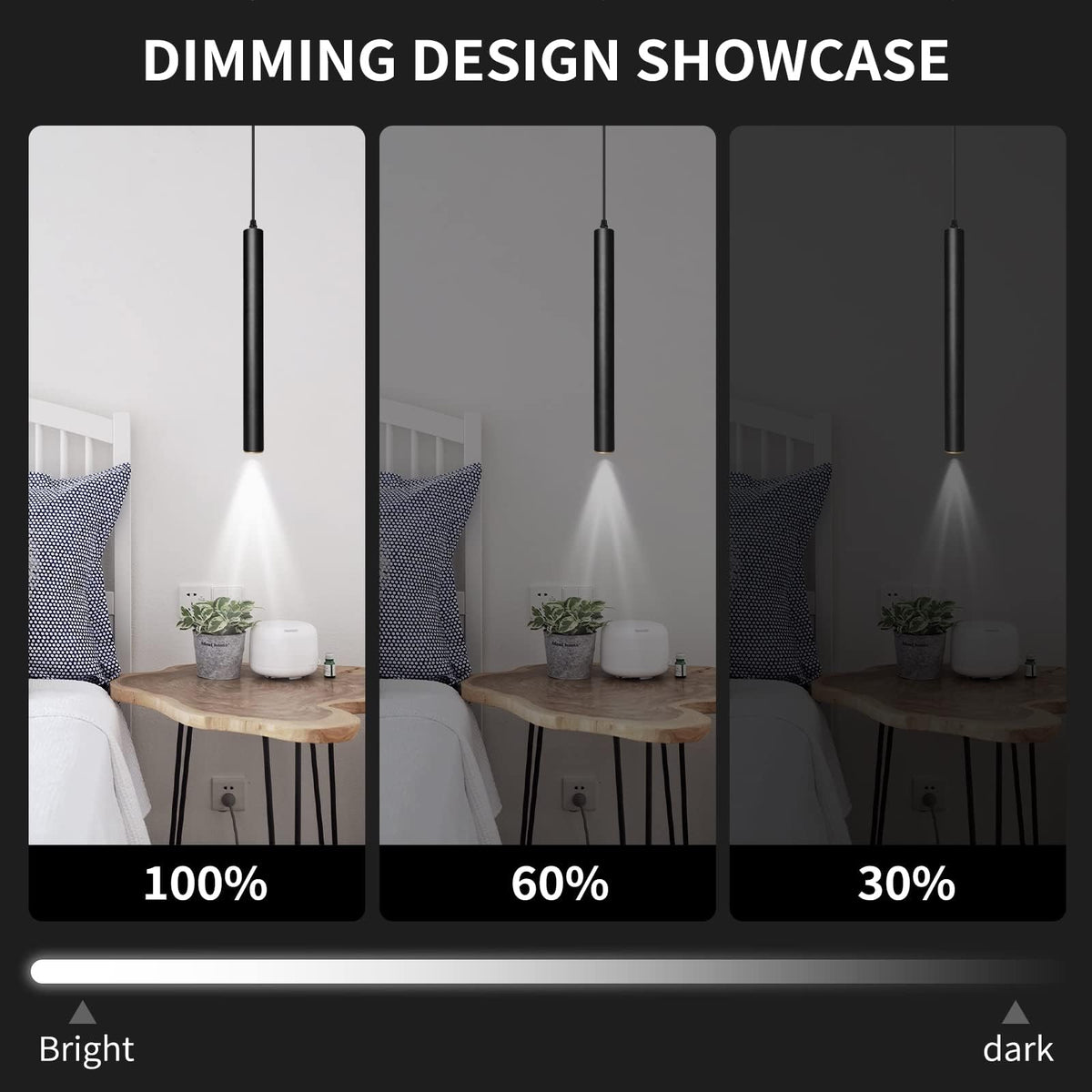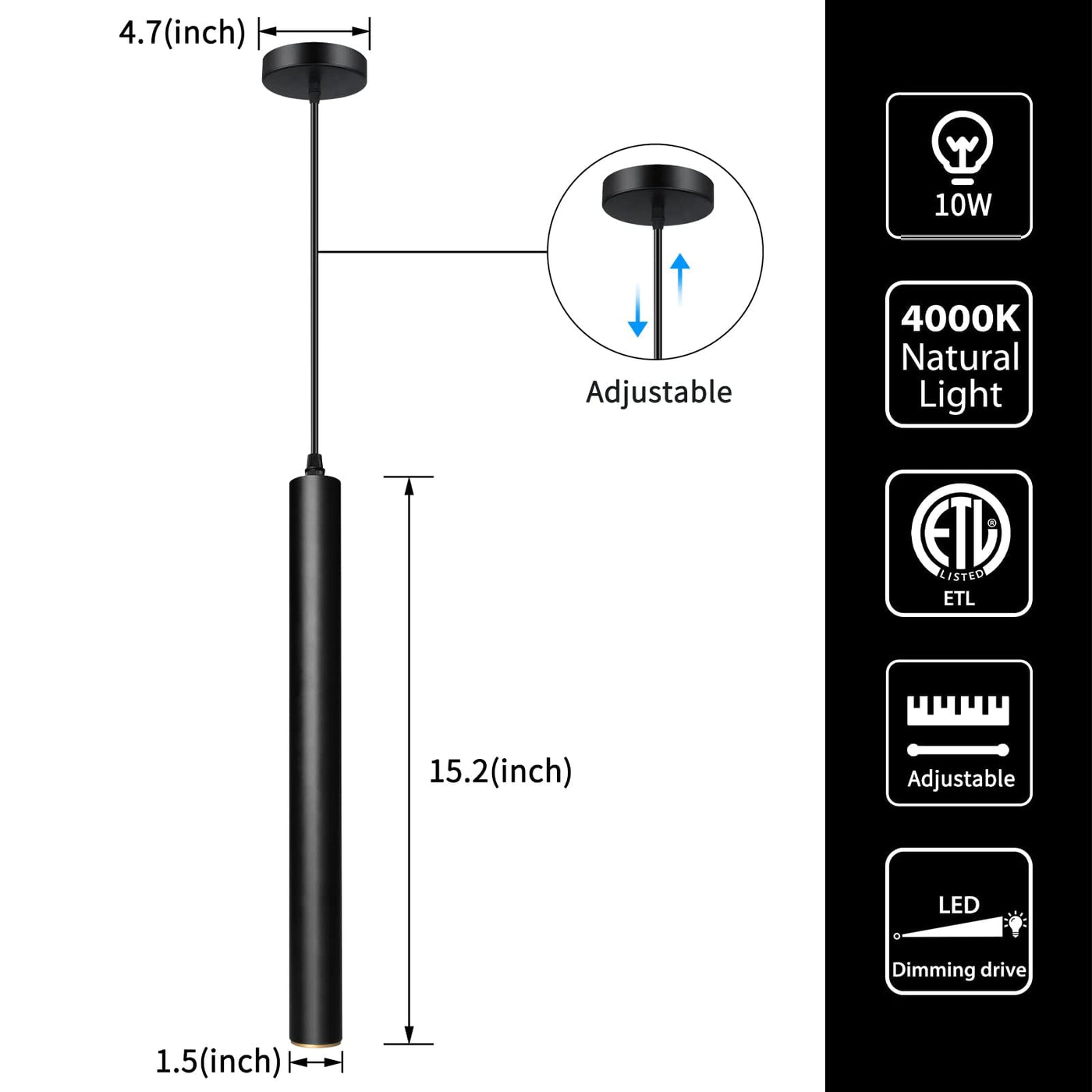 Classic Simplicity, The Work Of Artisan.Modern Pendant Light Fixture No Eyes-Harming Glare.Dimensions: L1.5 Inch * W1.5 Inch * H16.6 Inch (Adjustable Length 4-50 Inches).Power:10W.Luminous Flux:770 Lm.Voltage: 110V. Color Temperature: 4000K.Shape: Cylindrical & Black Color. The Surface Adopts Paint Spraying Process Finishes. Material: Aluminum.Bulb Type: Led Cob.Style: Modern.Our Led Pendant Light Is Suitable For The Dining Room, Kitchen, Living Room, Bedroom, Bar Used, But This Is Just A Suggestion,You Can Place This Fixture Anywhere In Your Home According To Your Needs.
