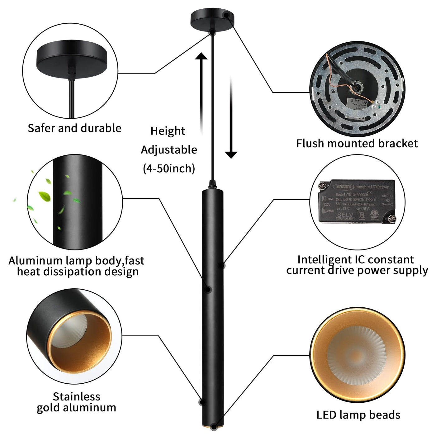 Classic Simplicity, The Work Of Artisan.Modern Pendant Light Fixture No Eyes-Harming Glare.Dimensions: L1.5 Inch * W1.5 Inch * H15.2 Inch (Adjustable Length 4-50 Inches).Power:10W.Luminous Flux:770 Lm.Voltage: 110V. Color Temperature: 4000K.Shape: Cylindrical & Black Color. The Surface Adopts Paint Spraying Process Finishes. Material: Aluminum.Bulb Type: Led Cob.Style: Modern.Our Led Pendant Light Is Suitable For The Dining Room, Kitchen, Living Room, Bedroom, Bar Used, But This Is Just A Suggestion,You Can Place This Fixture Anywhere In Your Home According To Your Needs.