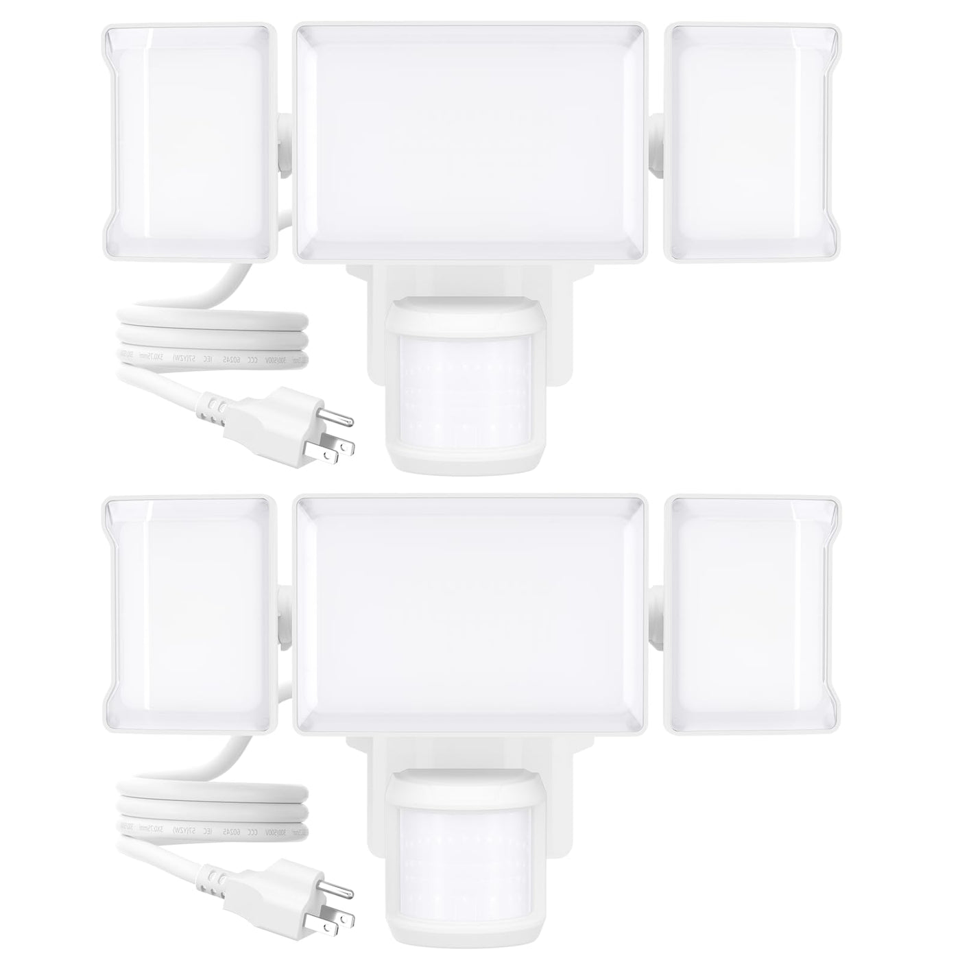Olafus 75W Motion Sensor Outdoor Light Plug in, 2 Pack Motion Flood Lights 3 Heads, 7500LM LED Security Light IP65, Motion Activated 6500K PIR Sensor Lighting for Garage Yard Porch Patio, White