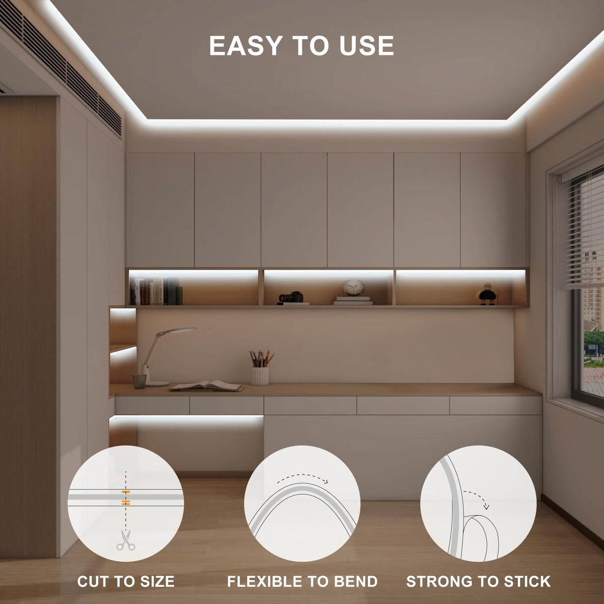 Q: What are the best places to use the Olaholii COB LED Strip Light?A: This COB LED Strip Light is perfect for a variety of settings, including your living room, bedroom, kitchen, cabinet, shelf, closet, desk, bed frame, mirror, and stairs, providing versatile lighting solutions throughout your home.