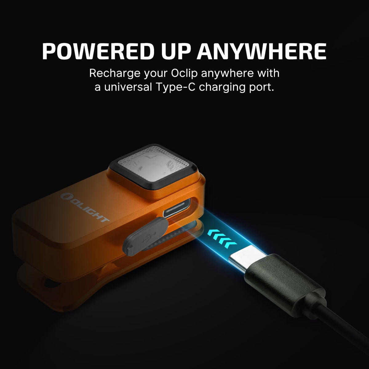 Q: How can I charge the OLIGHT Oclip flashlight?A: The OLIGHT Oclip is equipped with a USB Type-C charging port, allowing you to recharge it using various devices such as laptops, wall sockets, car chargers, and power banks. This makes it convenient to charge the flashlight wherever you are.