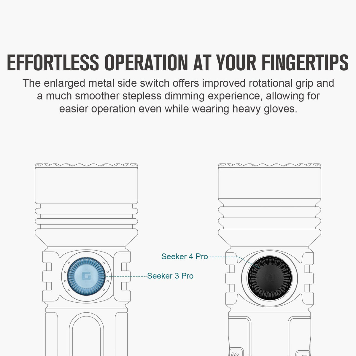 - **Durable and Waterproof**: The Seeker 4 Pro is designed to withstand harsh environments, boasting an IPX8 waterproof rating. The new hidden brightness and battery indicators ensure reliability without compromising on durability.