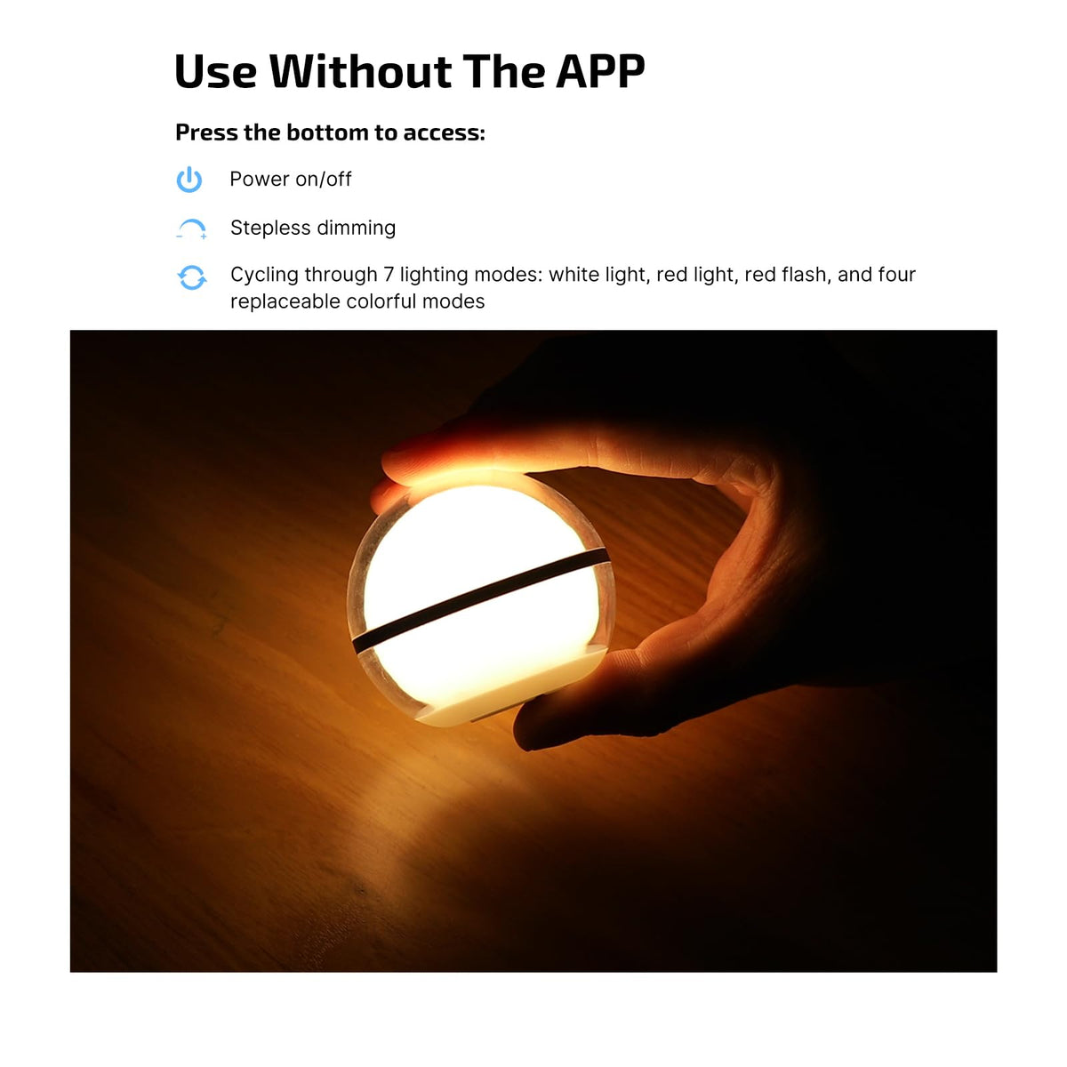 The Sphere Is Olight'S New Design Light. It Works As A Night Light Or Ambient Light That Can Be Used With Or Without App Control. Its Transparent Shell Creates A Sense Of Depth, While The ''Full Sphere Design'' Provides A 360-Degree Light-Emitting Surface For A Superior Viewing Experience. With 7 Bottom Switches Accessible And 20 App-Controlled Lighting Effects-Including White, Colored, And Themed Options-It Adapts From A Cozy Night Light To A Mood Light Or A Signaling Light. Additionally, It Offers Interactive Features Like The Bash-A-Mole Game, Group Control, Countdown Timer, And Music Rhythm. Rechargeable And Portable, It? Ideal For Daily Use, Relaxation, Parties, Dating, Camping, And Decoration. Light Sources High Performance White And Rgb Leds In The Box Sphere X 1 Mcc 1A X 1 Adhesive Metal Badge X 1 User Manual X 1