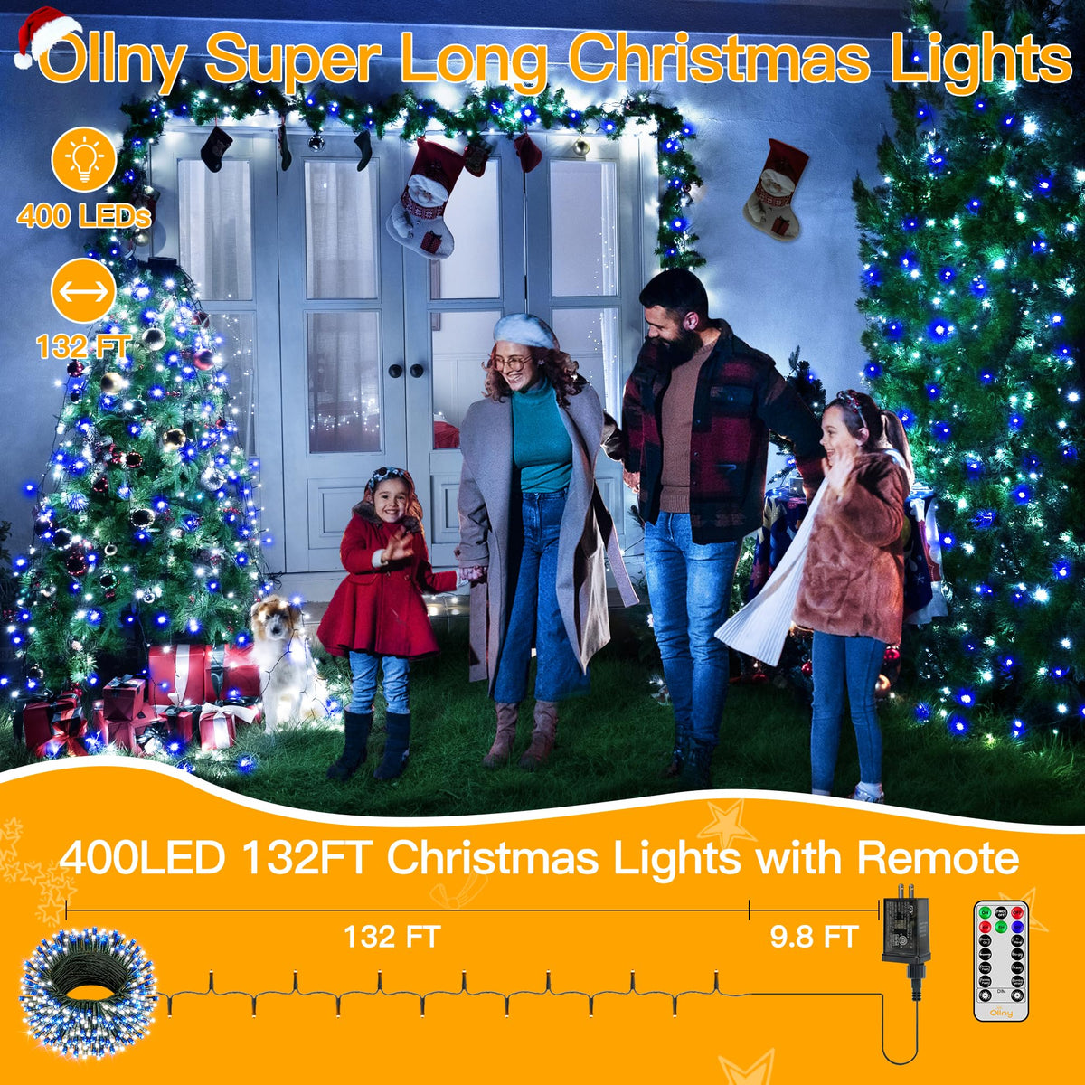 Ollny Christmas Lights - 400LED Blue & White String Lights, 131FT, Waterproof, 8 Modes, Remote for Indoor/Outdoor Decor, Model HG-29V415C