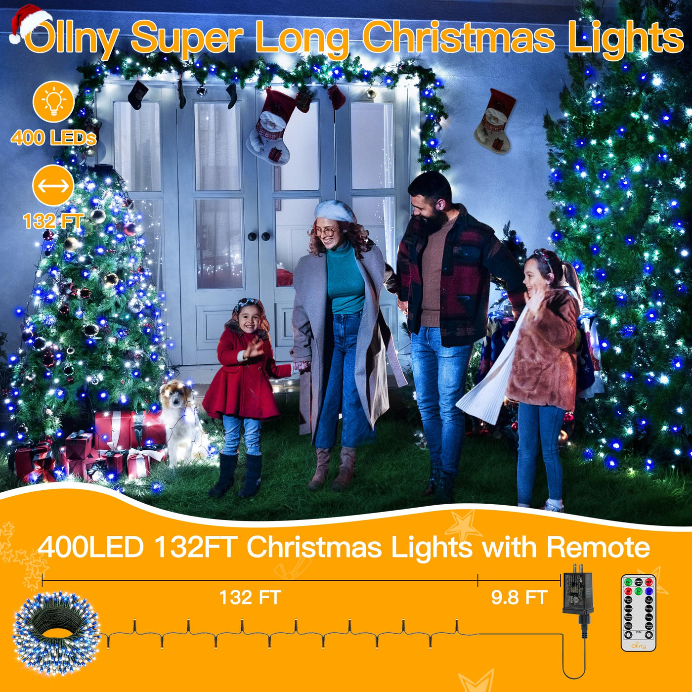 Q: What are the dimensions of the Ollny Christmas lights?A: The Ollny Christmas lights measure one hundred thirty-one feet in length and feature four hundred LED bulbs.