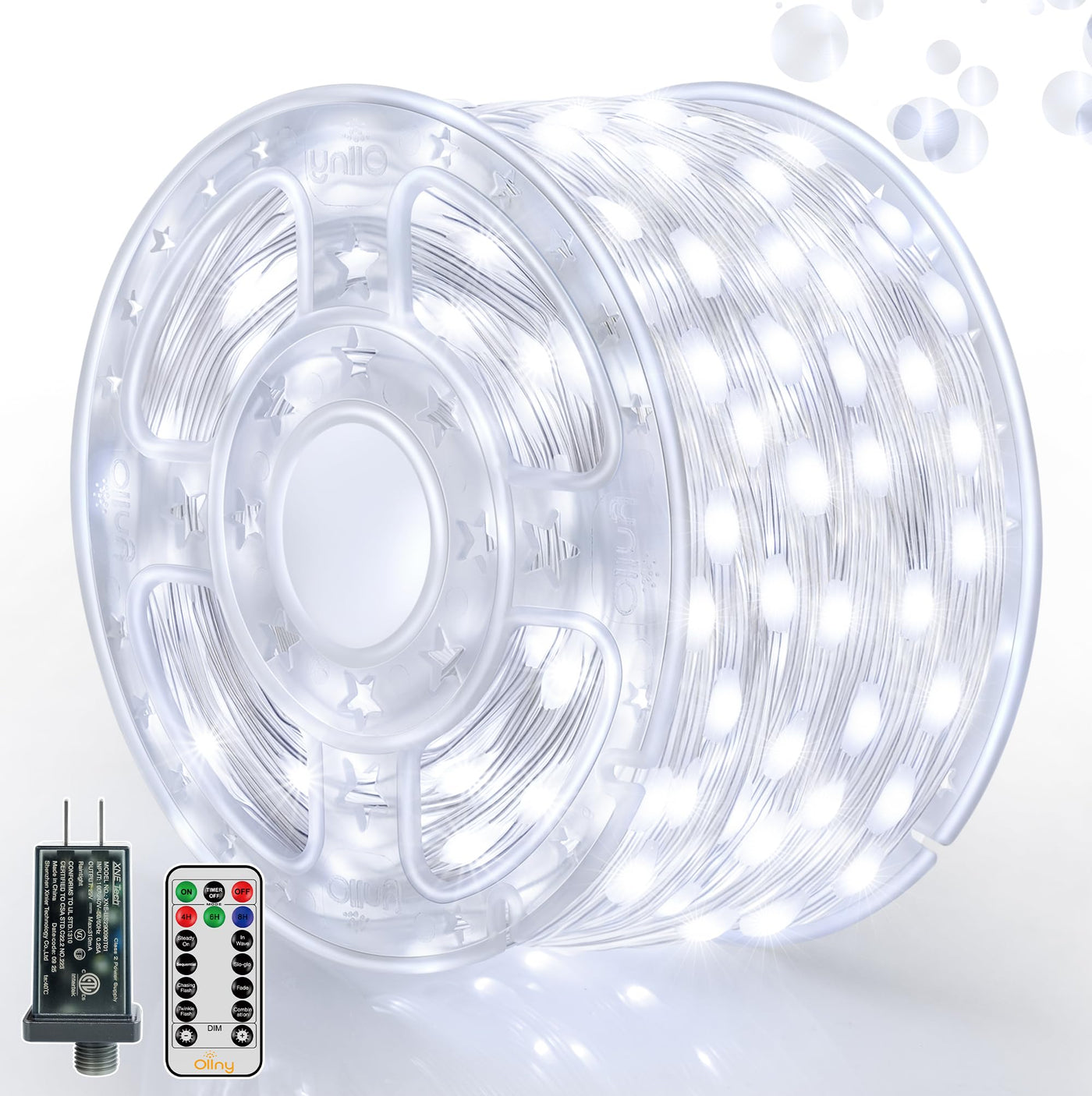 Ollny Xmas Tree Lights Cool White Ollny led christmas lights outdoor, 1000LED 328FT cool white tree lights for indoor outside decoration Easy to Hanging Ollny christmas light indoor with spool, you just unwrap as you go, and don t have to worry about anything getting tangled. IP67 Weather-resistant The clear wires, controller and christmas rope lights outdoor are IP67 waterproof rated, it can use outdoor or indoor. No need to worry about bad weather. UL Listed Christmas Tube Lights UL LISTED Certificated plug included, light up your place while ensure max security. 8 Mode & 4 Level Brightness & 3 Timers & Memory ?Including Steady ON, In Wave, Sequential, SLO-GLO, Chasing Flash, Fade, Flash, COMB. ?Dimmable: Press DIM+/Dim- via remote controller to adjust brightness level ( 100% 75% 50% 25% ) ?3 Timers: 4 hours on and 20 hours off; 6 hours on and 18 hours off; 8 hours on, 16 hours off ?Memory: No need to reset last time setting. Supre Long Fairy Lights 328ft and extra 9.8ft extension cord, exterior christmas lights coverage area to an impressively to cover house, home, bedroom, hedges, treetops, walls, hedges, shrubs, fences, tree trunks, railings, windows, poles and columns. Widely Used Perfect for your Christmas, Thanksgiving, birthday, party, holiday, garden, patio, yard decorations. 12 MONTH WARRANTY Package include: 1x 1000 LED Christmas lights, 1x Remote Controller, 1x UL Plug; 1x User Manual, 1 x Storage Reel. Moreover, Ollny offers a 12-MONTH WARRANTY to all our products. Please feel free to contact our customer support team with any questions or concerns.