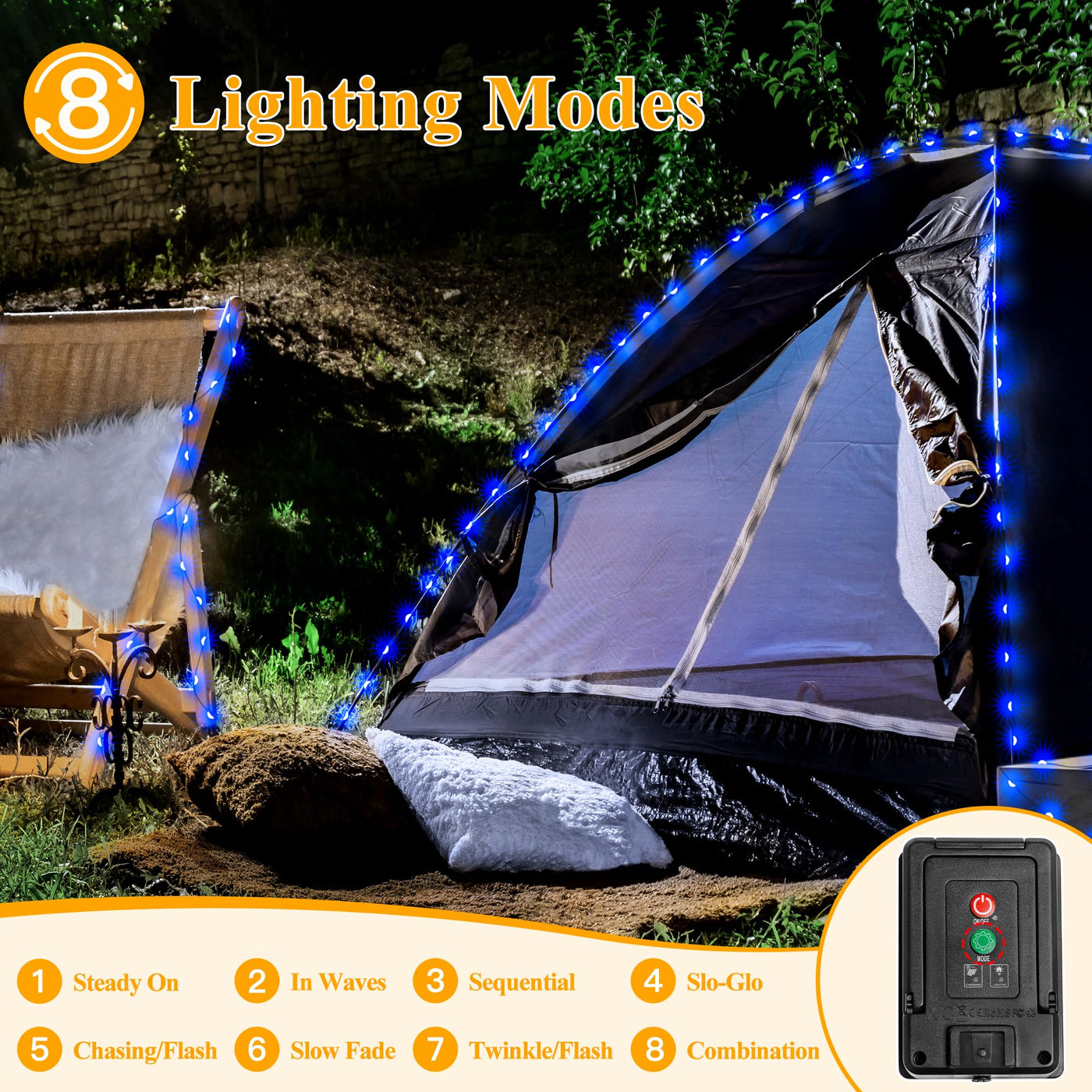Q: What are the different lighting modes available for these solar lights?A: These solar string lights offer 8 different lighting modes, including steady on, in wave, sequential, slo-glo, chasing flash, fade, twinkling flash, and combination, allowing you to choose the perfect setting for your occasion.
