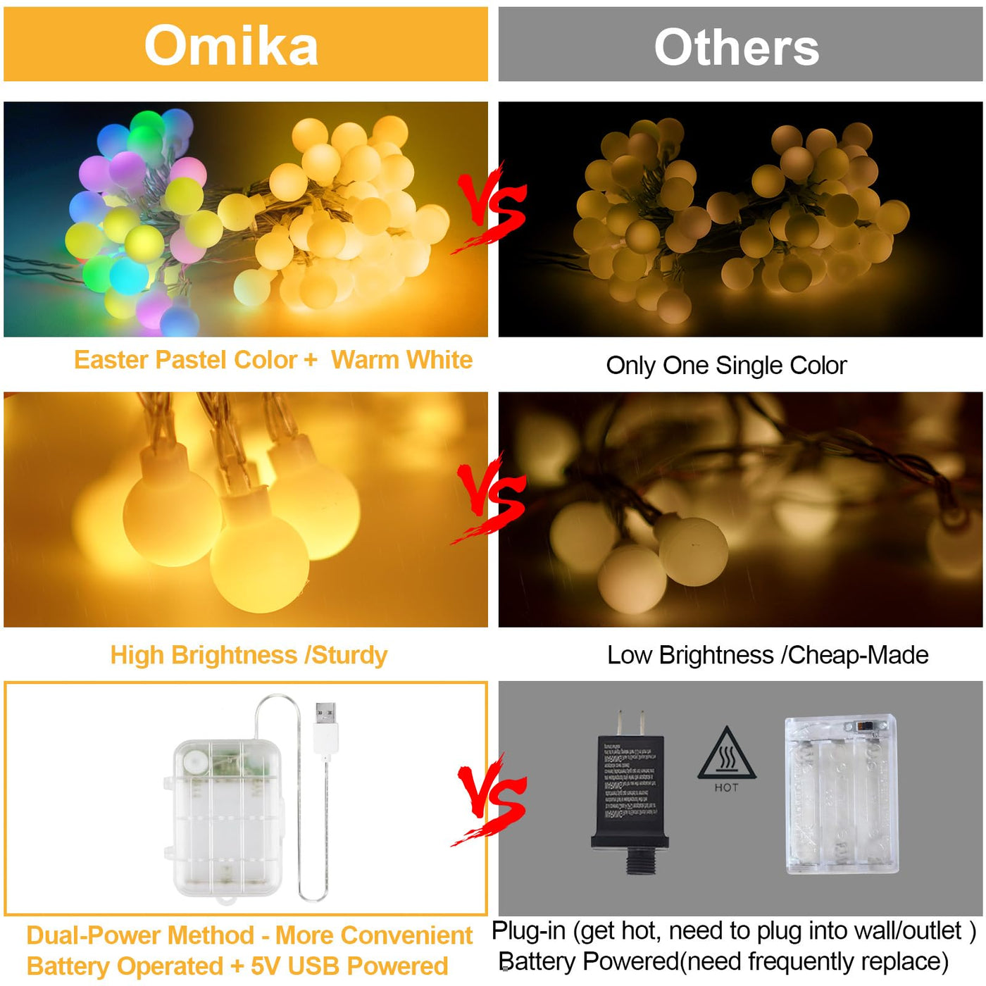 Q: How long is the OMIKA string light set and how many LEDs does it have?A: The OMIKA string light set is 33 feet long and features 100 LEDs, which includes cute frosted globes in soft pastel colors mixed with warm white.