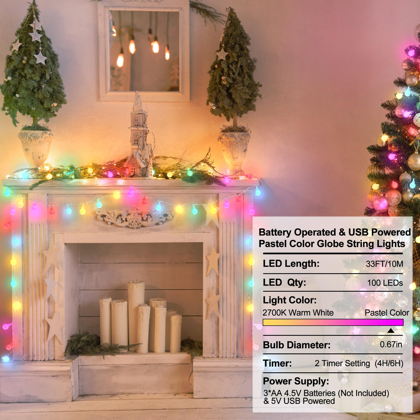Omika 33Ft Pastel Christmas Lights Battery Operated, 100 Leds Warm White Fairy Lights, Usb Powered String Lights With Remote For Indoor Outdoor Xmas Party Girls Bedroom Pastel Decor
