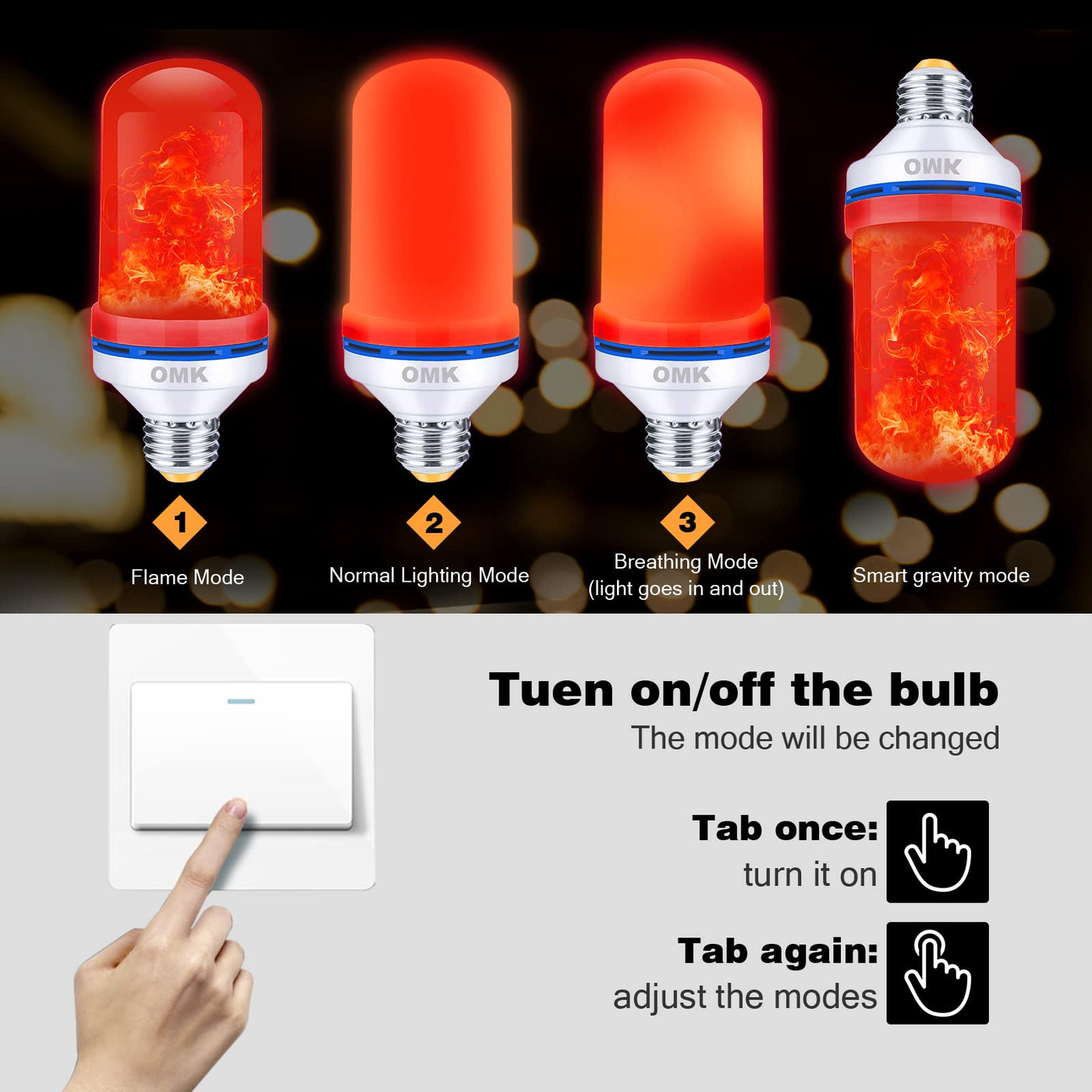 Q: What are the different lighting modes of the OMK LED Flame Effect Light Bulb?A: The OMK LED Flame Effect Light Bulb features four unique lighting modes: 1) Flame Mode for a lively flickering effect, 2) Normal Lighting Mode for steady illumination, 3) Breathing Mode where the light gently fades in and out, and 4) Gravity Induced Mode that changes the flame direction when the bulb is turned upside down.
