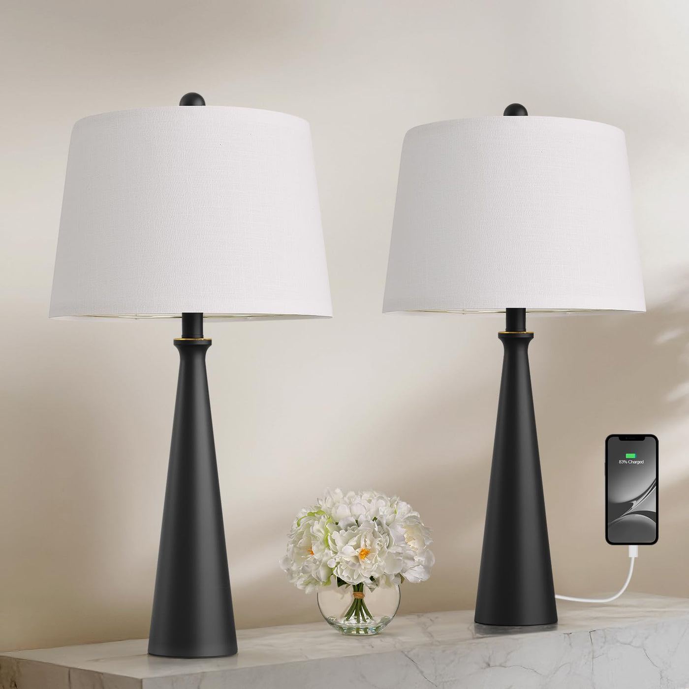 Oneach 25.75'' Modern Table Lamp Set Of 2, Bedside Lamps With Usb Ports, Black Nightstand Lamps Set For Living Room Bedroom Hous