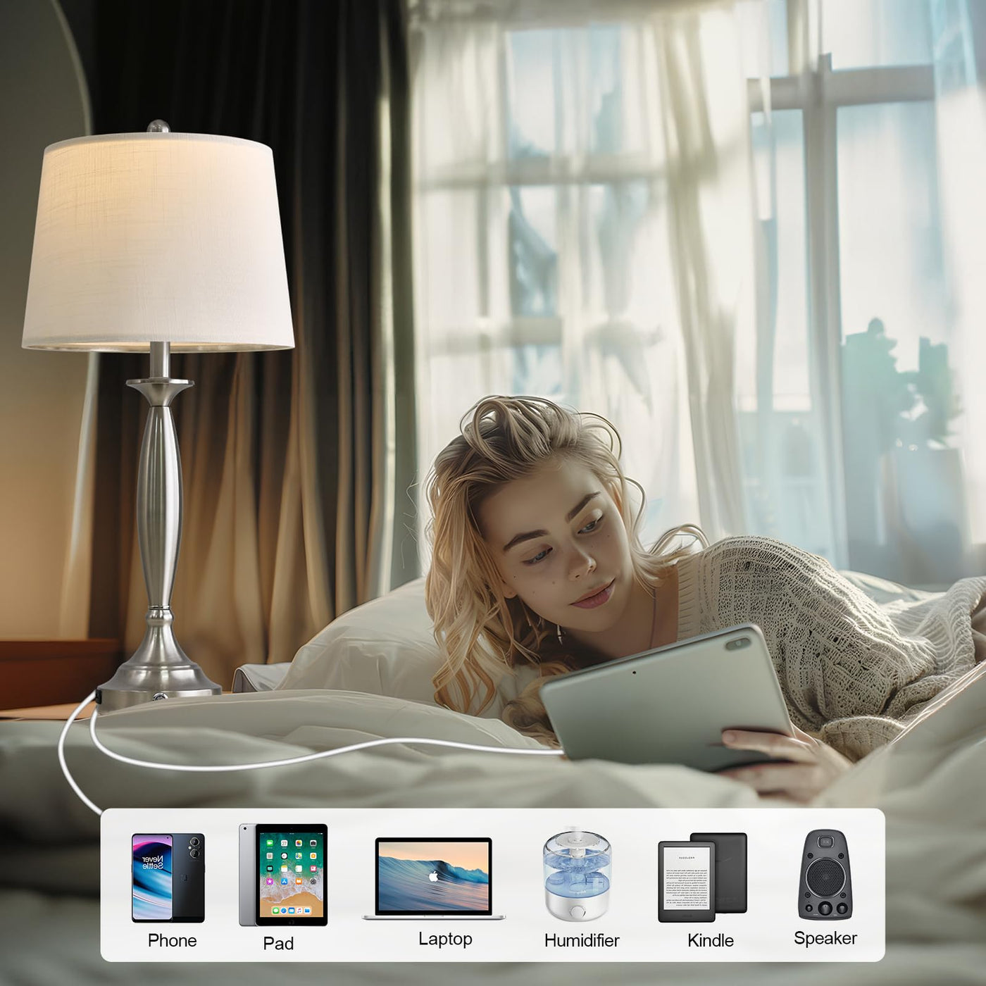 - **USB Charging Ports**: Each lamp is equipped with a 5V/2A USB charging port, enabling you to charge your devices like smartphones, tablets, and eReaders without needing to search for an outlet. Stay connected and powered up, whether the lamp is on or off.