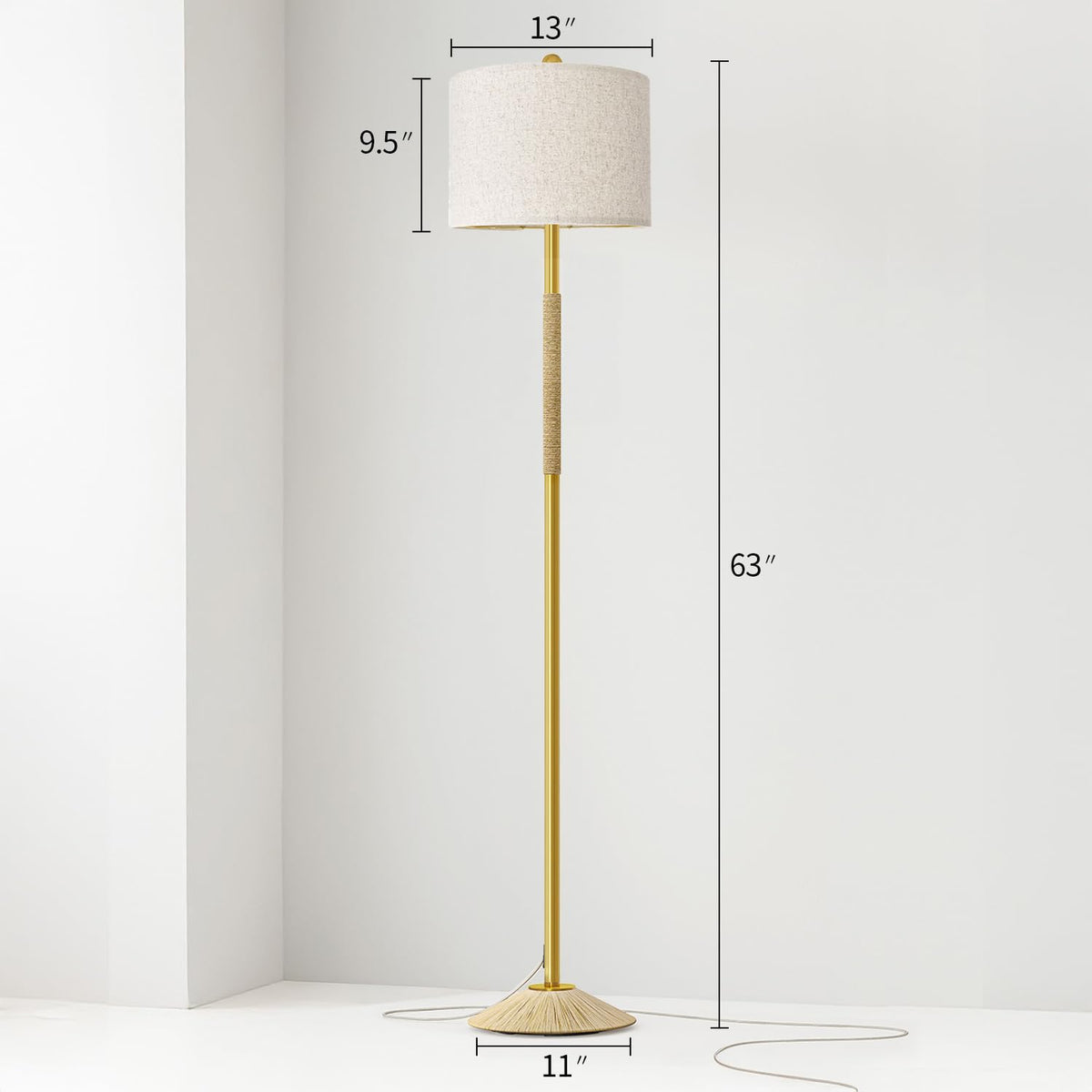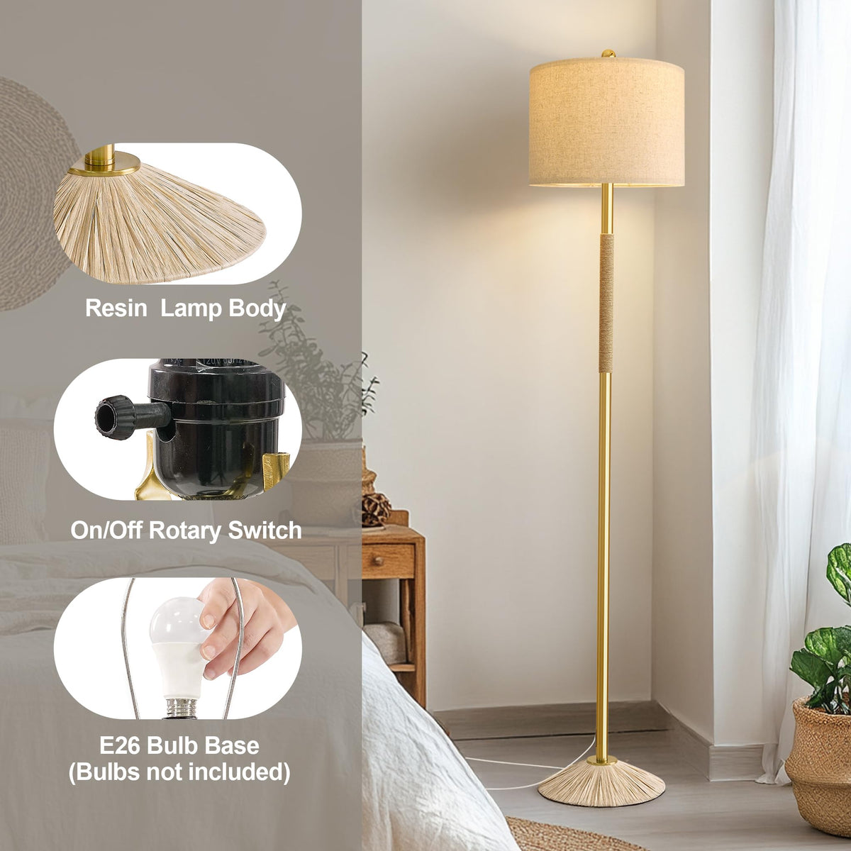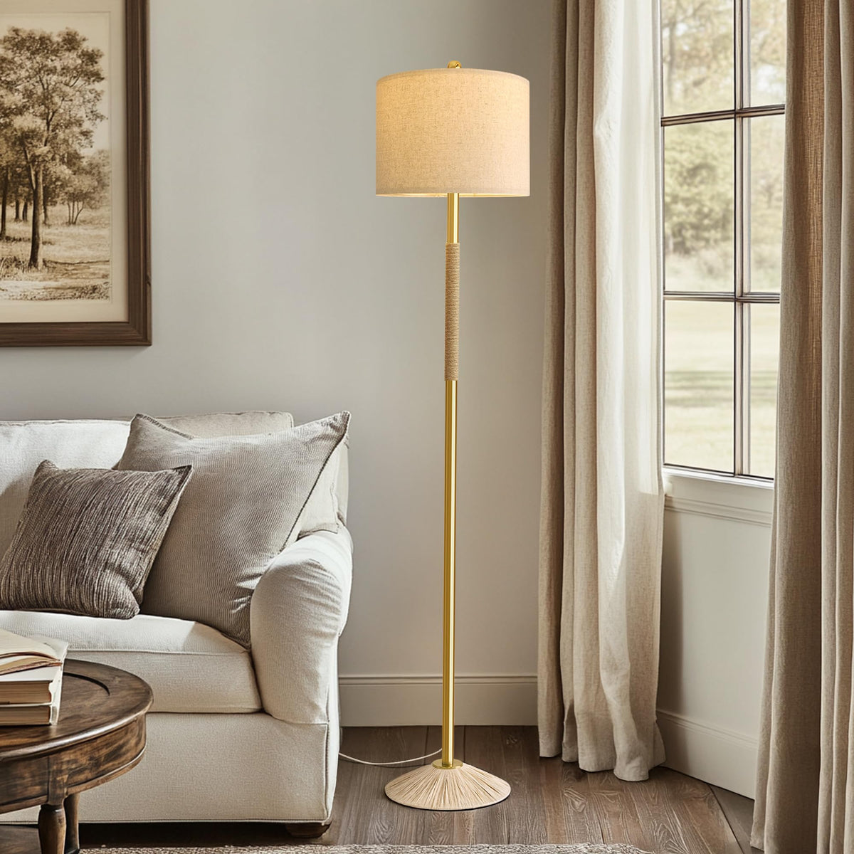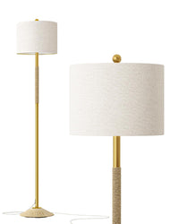 Q: What styles of decor does the Oneach floor lamp complement?A: The unique elegant design of the Oneach floor lamp, featuring a gold pole wrapped in rope and a natural linen shade, complements a variety of decorating styles including Modern, Classic, Country, Vintage, Farmhouse, Coastal Nautical, and Northern European.