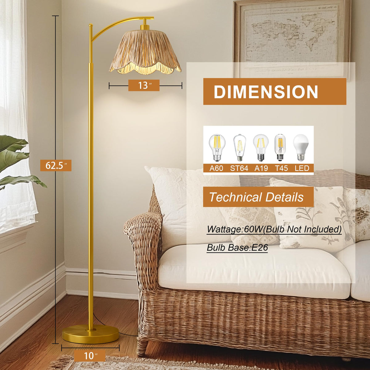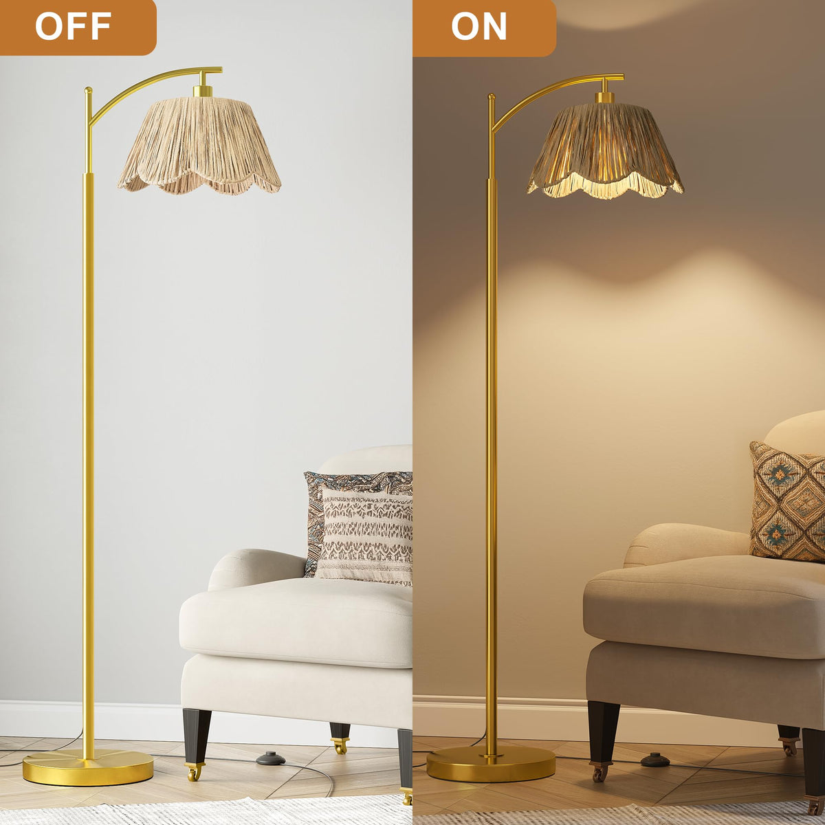 Oneach Arc Floor Lamp For Living Room,Rattan Boho Floor Lamp With Hand-Woven Wicker Shade, Foot Switch,Gold Metal Base & Pole,Fa