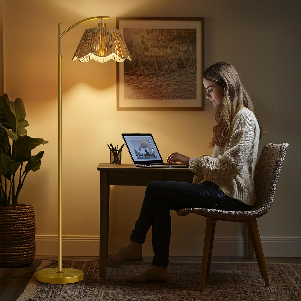 This boho floor lamp boasts a handwoven rattan shade that enhances your home with natural charm and texture. The gold metal pole and base provide a sleek, modern contrast, making it a perfect blend of rustic charm and contemporary style. Ideal for living rooms, bedrooms, or offices, this lamp enhances any space with its timeless design.
