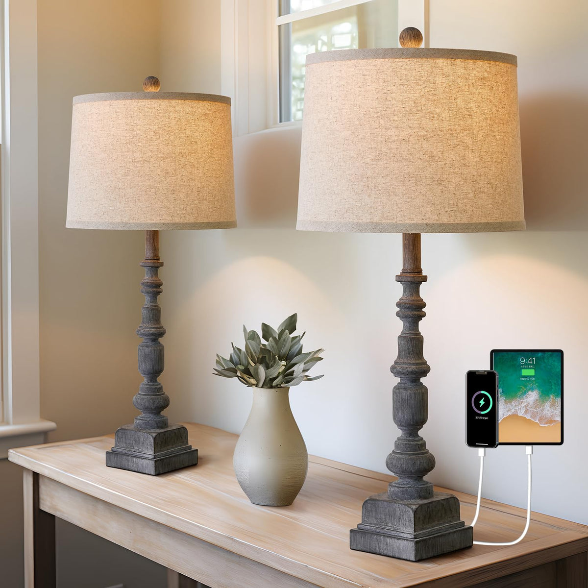 Oneach Vintage Farmhouse Table Lamps Set Of 2 With Usb A+C, Antique Grey, Mid Century Design