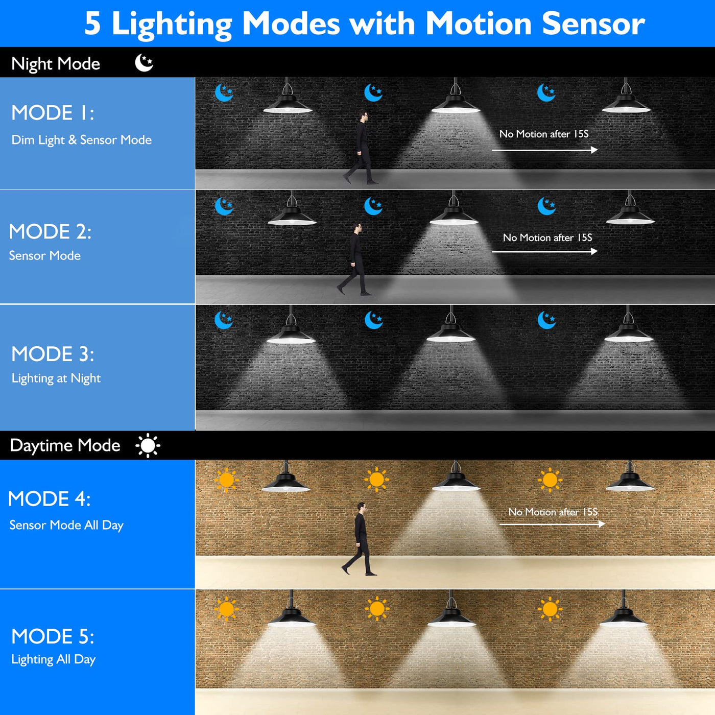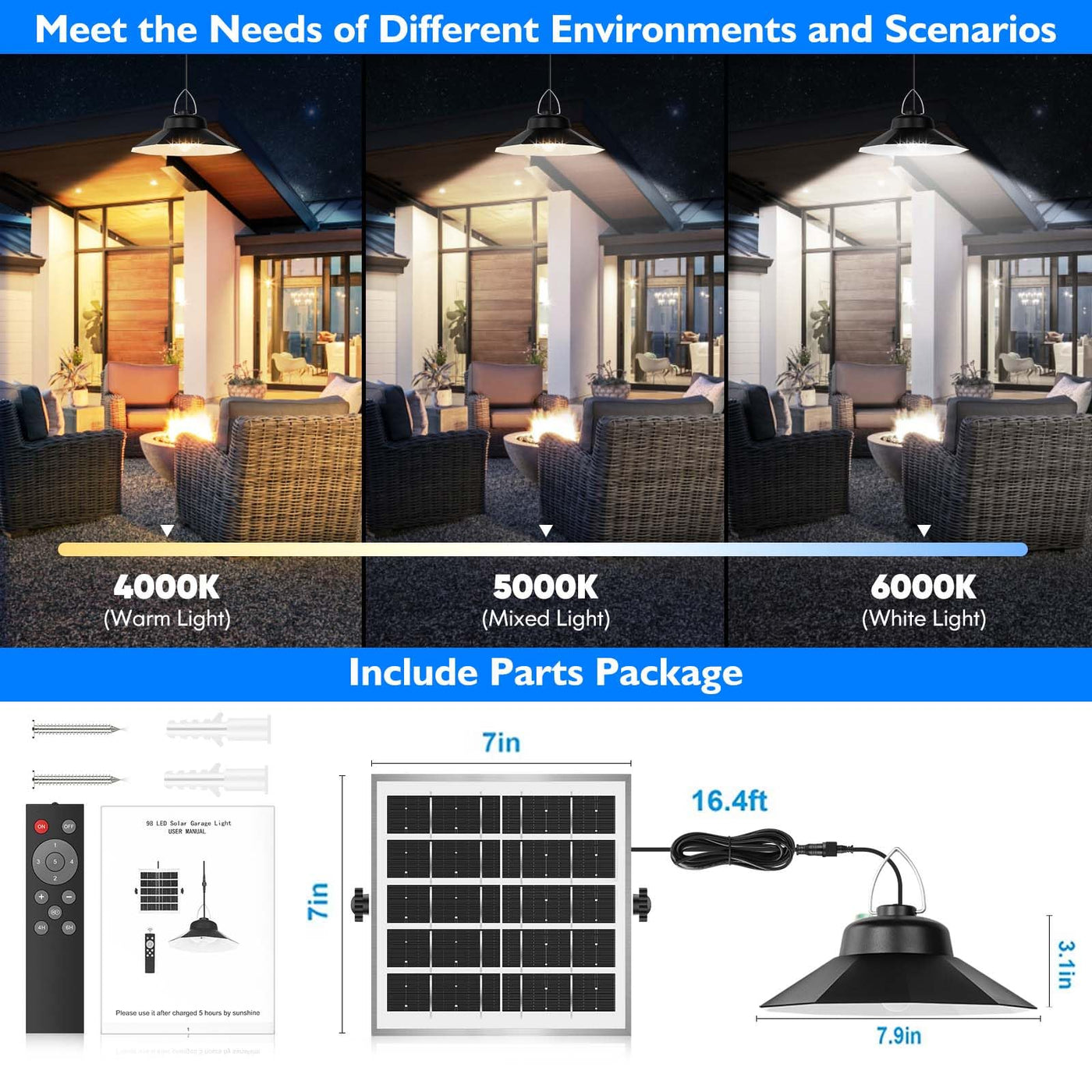ONELEJA outdoor solar motion sensor shed lights with 5 lighting modes. Mode 1: OFF-Bright-Dim; Mode 2: OFF-Bright-OFF; Mode 3: 50%Bright,Steady on; Mode 4: OFF-Bright-OFF (not controlled by light); Mode 5: 50%Bright,Steady on, not controlled by light.It can provide lighting even in the daytime.Non-light control mode You can easily choose different modes and brightness to meet your different requirements.The outdoor waterproof solar motion pendant lights Built-in 4400mAh battery, you can enjoy lighting without electricity charge, solar outdoor light in the sun charging time 5-6 hours, can be used 8-12hours, Energy-saving - Let you enjoy lighting without electricity bills!Our solar lights indoor comes with a remote control, which allows you to adjust brightness,choose the working mode and set timing. The solar garage light can be attached directly to the wall with screws, ensure that outdoor LED solar lights panel faces sunlight, Very convenient to use! The Solar barn lights outdoor waterproof light comes with IP65 waterproof design and is connected to the solar panel with a 16.4 feet cable. This solar security lights outdoor are made of aluminium. IP65 waterproof design and can withstand all kinds of terrible weather! The solar garage light can be attached directly to the wall with screws.This solar powerd shed lights has 3 Color Temperature: 4000K-6000K( Warm,White,Mix color), 3 in 1, which can meet the needs of different environments and scenarios, such as garden, courtyard, terrace, balcony, workshop, green house work, stairs, barn, chicken coop, storage shed, patio, umbrella, porch, front door, interior, pergola, yard, kitchen, chicken coop, cabin, etc.