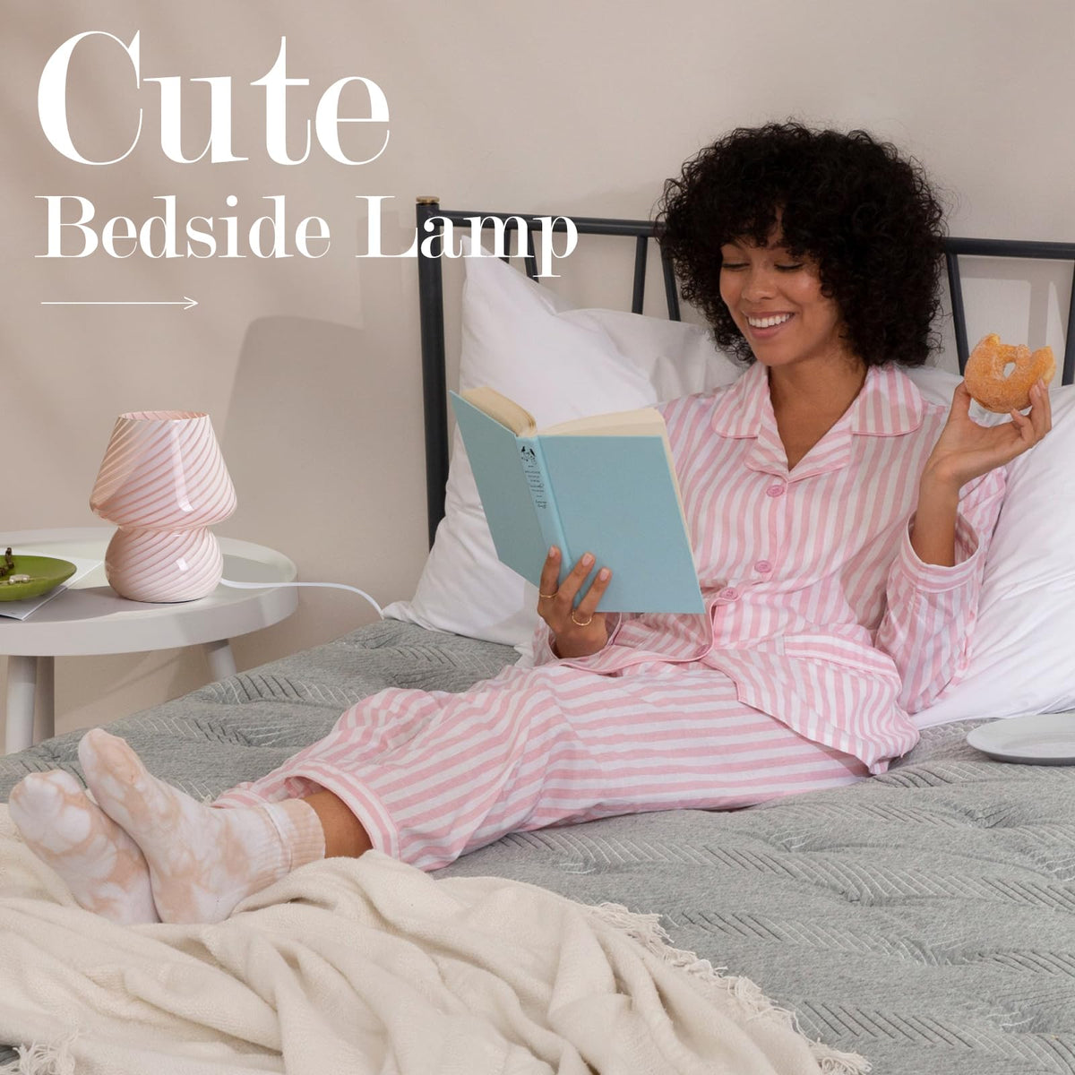 Onewish Mushroom Lamp-Small Bedside Table Lamp With Striped Glass, Nightstand Lamp For Bedroom, Living Room, Cafe, Bulb Included
