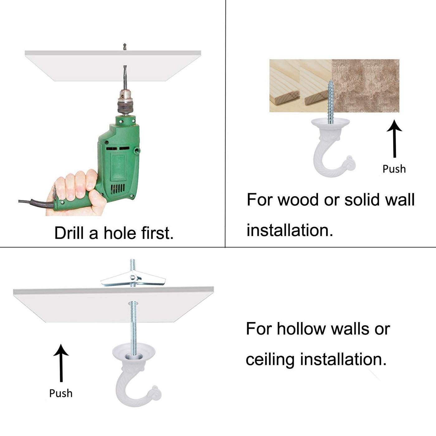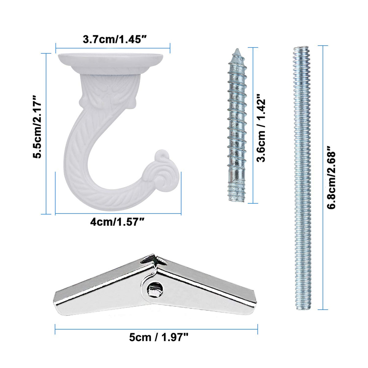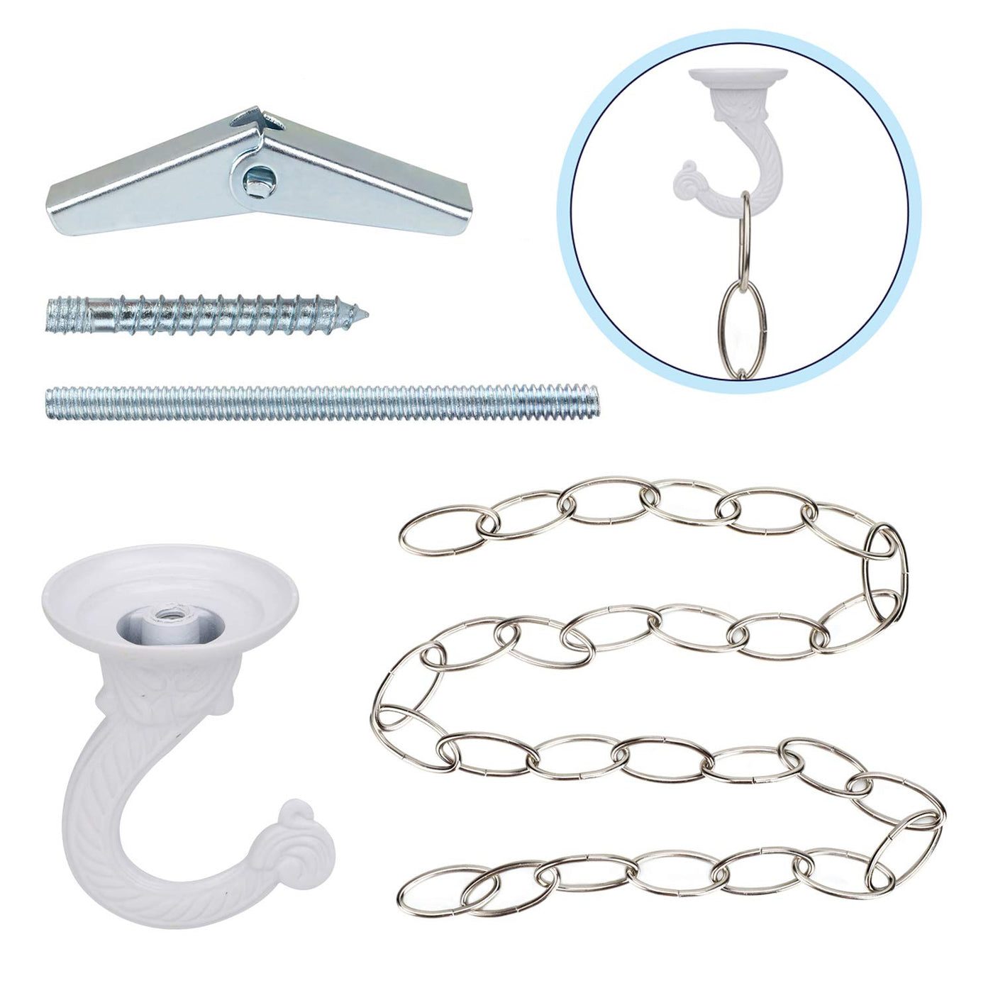 If you are looking to hang lights or flowers from your ceiling, this hook set will help you! Universal ceiling hook with 36 inch chain extension, easily change the height of your hanging items. Specifications: Item: metal ceiling hook and chain Material:Zinc alloy Color: white, looks elegant and fashion. Size: Swag hooks: 5.5cm x 4cm / 2.17 '' x 1.57 '' Long bolt: 6.8cm / 2.68 '' Pointed screw: 3.6cm / 1.42 '' Spring toggle wings: 5cm / 1.97 '' Chain: 91.5cm / 36 '' Uses:Install on a ceiling, veranda, porch, gazebo to hang some heavy items, like plants, fruit basket, lights, tube feeders, etc. Use tips: When installing on concrete walls or ceilings, use an electric drill instead of a hammer, to make installation easier and reduce damage to screws and buildings. The chain is easy to use, if you want to separate it, just use pliers to bend open one of the rings. Wide application: It works perfectly for plant pot, tiered baskets, light fixtures, lanterns, candle holder, chandelier, billiard light, paintings, mirror, bird feeders, wind chimes, privacy signs, antique scale, clothes hanging, it also can be used as Halloween or theater props. Package: 1 x ceiling hook and screw 1 x 36 inches metal chain
