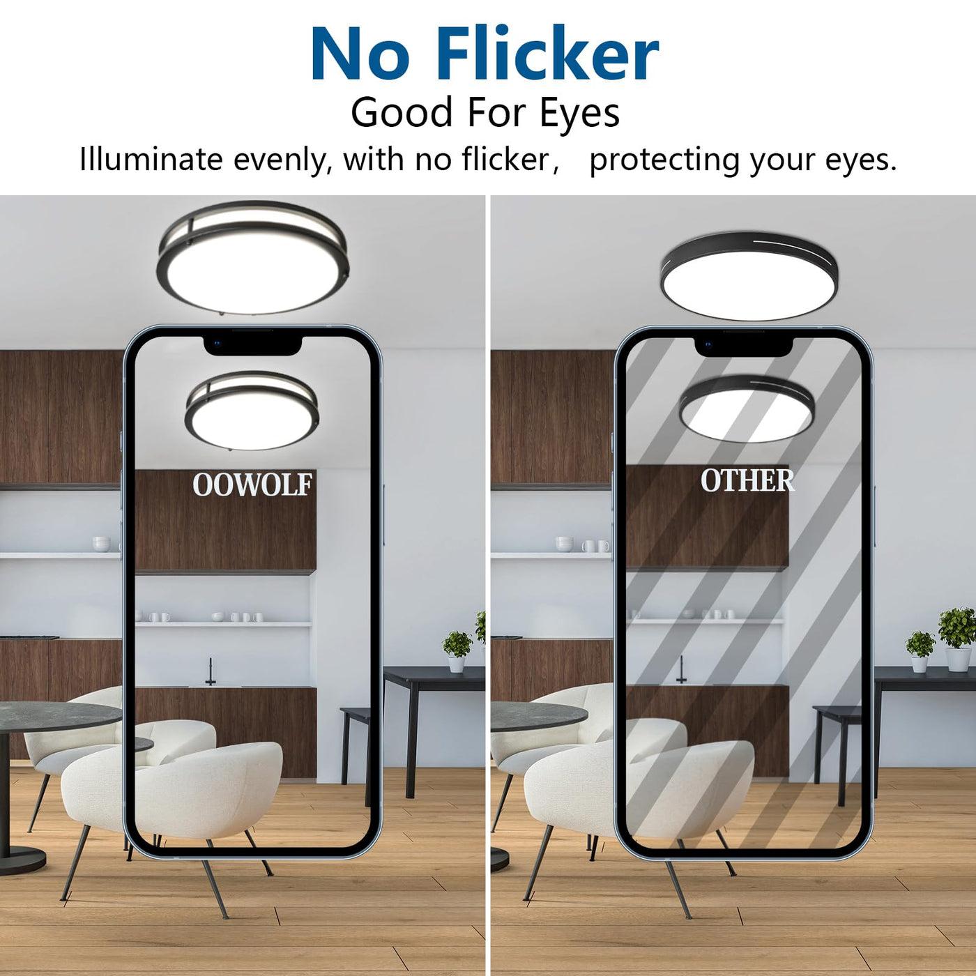 Q: Is the OOWOLF ceiling light suitable for eye protection?A: Yes, this LED ceiling lamp is designed to provide even illumination without flickering, helping to protect your eyes during use.