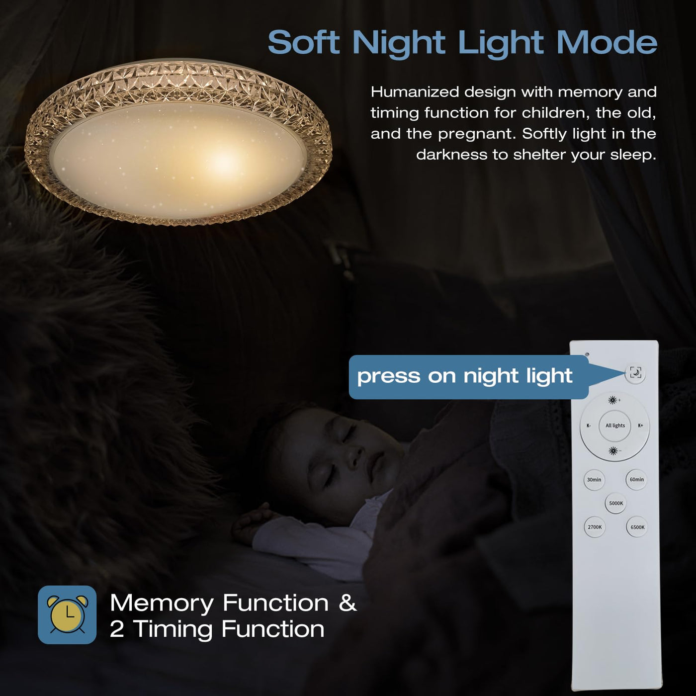 Q: Can the OOWOLF LED Ceiling Light be used as a night lamp?A: Yes, the OOWOLF LED Ceiling Light has a night light mode that reduces brightness to five percent, making it suitable for use as a night lamp, which helps improve sleep quality.