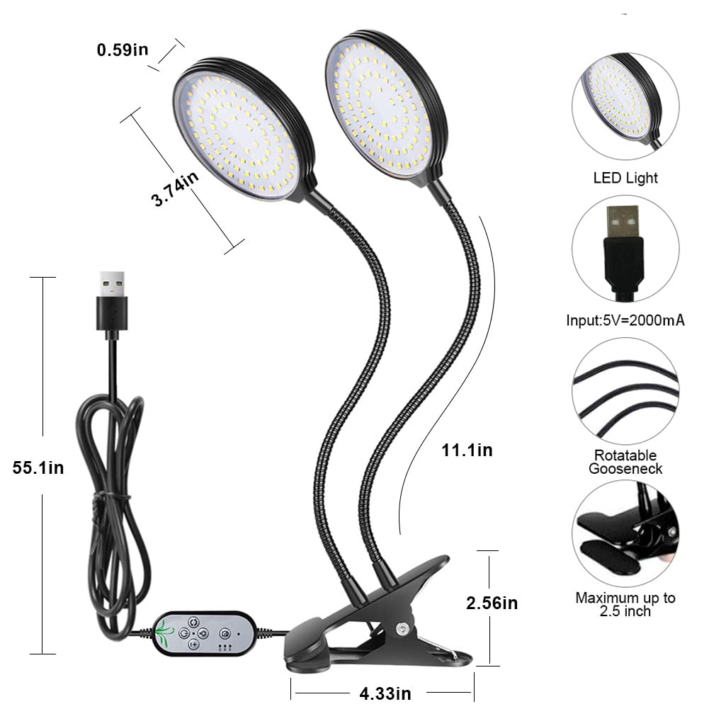 Specifications: - Use USB power supply mode. - There are 2 lamp holders, and the lamp holder can be switched on mode, as well as timing function. - It can rotate 360 degrees to meet your need for plant growth light. - Efficient waterproof, you can water it directly. - Multi-stage dimming, effectively control of illumination brightness. - The use of plant growth lamps can effectively improve the growth of plants and increase the yield of crops. - Especially suitable for potted enthusiasts.