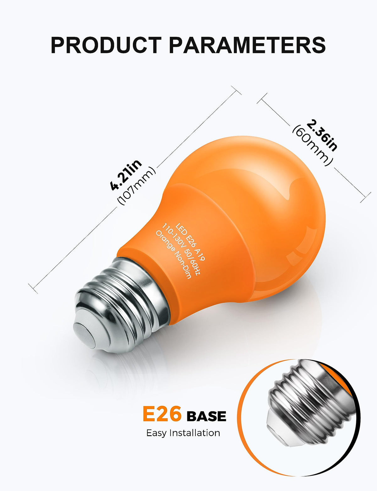 Specification 1.Power: 9W 2.Input Voltage: 110-130V 3.Lamp Base: E26 4.Size: 6*6*10.8 CM 5.Energy Saving 90% 6.Warranty:30000 hours. 7.Guarantee Period:1years 8.Dimmable: NO What s include: 4 x LED Colored Bulbs(Orange )