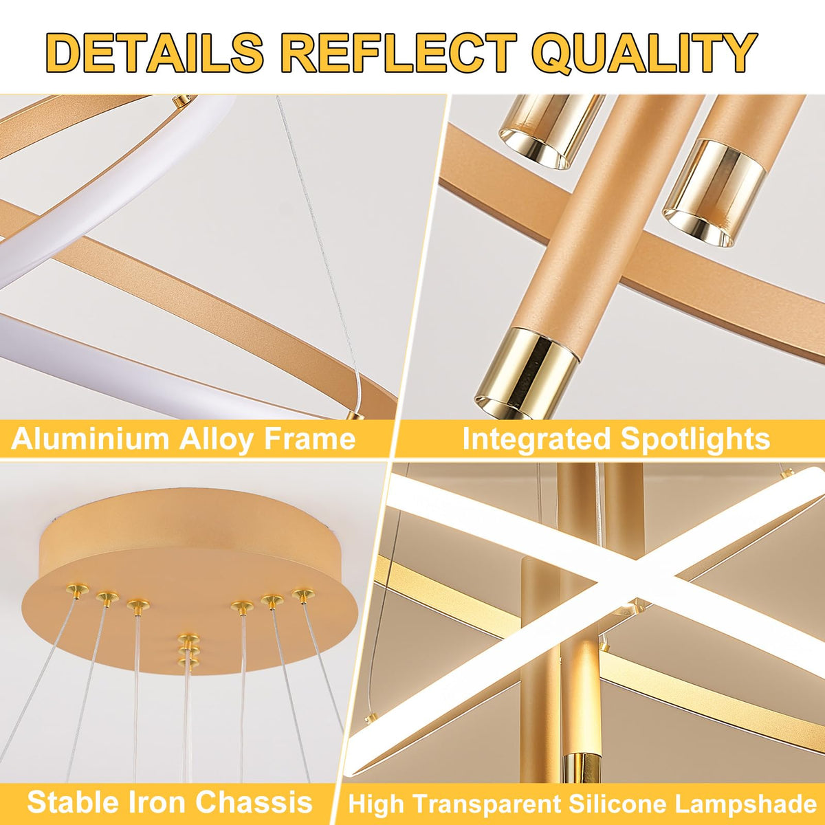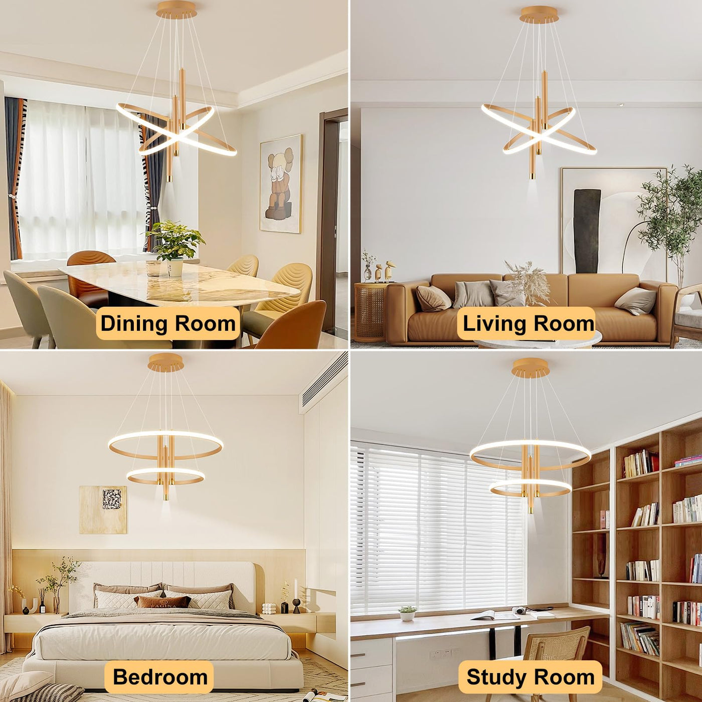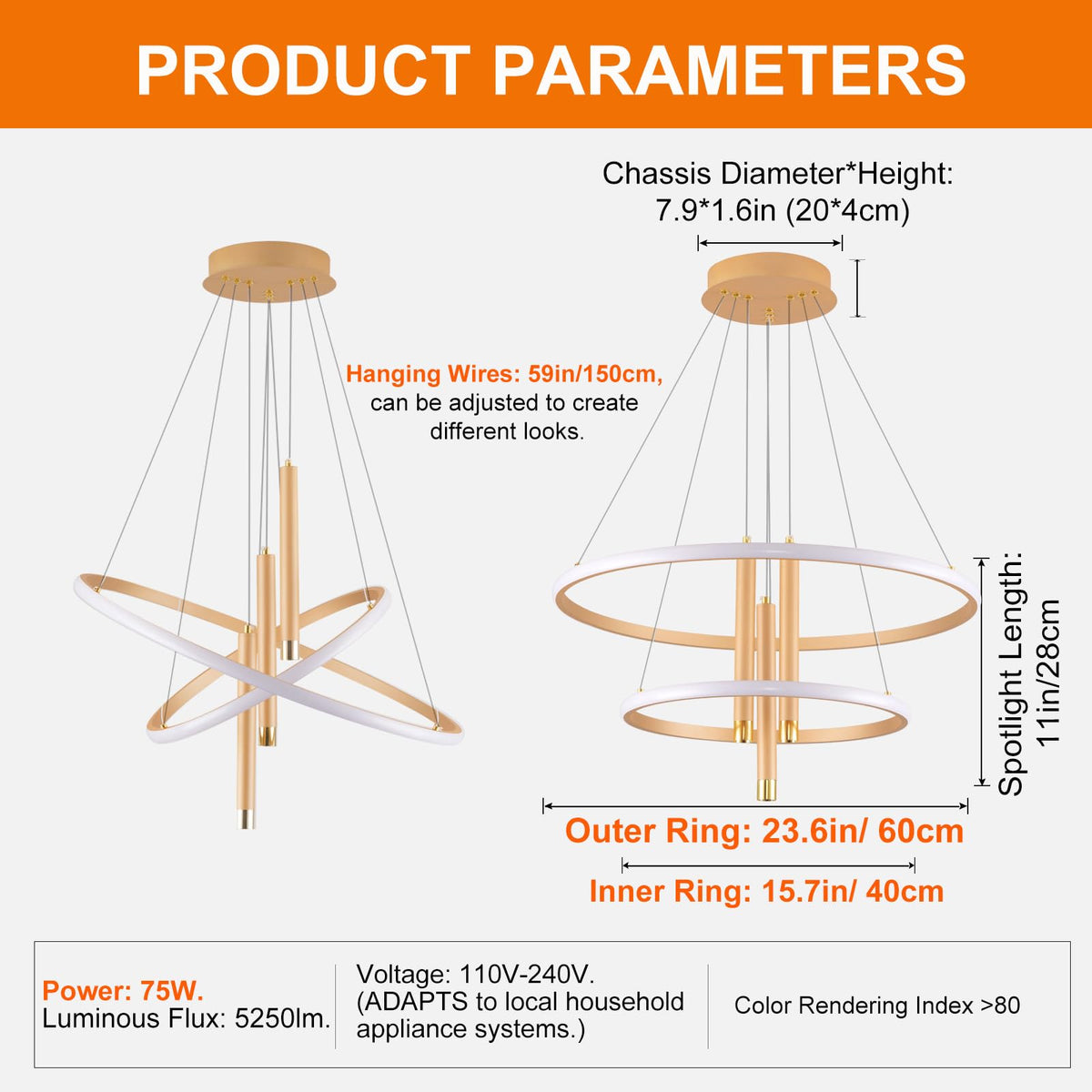 Modern led Pendant Light Chandelier Light Fixtures ORANOOR LED Gold Modern Chandeliers for Dining Room Bedrooms Living Room, Dimmable 24in 5250lm Kitchen Pendant Lamp Dining Room Light Fixtures Ceiling Hanging Over Table, 2 Ring Round Chandeliers gold chandelier lighting fixture pendant lamp Bedroom staircase Living room foyer round hanging chandelier ceiling light dining room light fixtures over table modern led pendant chandelier Lighting kitchen dining table pendant lights kitchen island ??Fully Dimmable with Remote + Various Functions?-Brightness: 10-100%. Color Temperature: 3000-6000K. According to your preference, you can adjust the gold LED chandelier light fixture through the matching remote. Memory Function & Nightlight Mode can also be achieved via our matched remote control. [PS: NOT compatible with wall Dimmer switch.] ??Upgraded LED Chip + Stable Performance?-Power: 75W. Luminous Flux: 5250lm. (Please refer to the display video.) Voltage: 110V-240V (Suitable for local electricity standards). With upgraded LED light source, the gold chandeliers for living room is more efficient and energy-saving, stable and no flicker, soft light protects your family's eyes. The gold pendant lights kitchen island has CRI 80+ ??Design It Yourself + Suitable Size + Widely Used?-Diameter of the 2 rings: 23.6+15.7in (60+40cm). The modern LED chandelier can be used as dining room light fixtures over table, or modern light fixtures ceiling for household and commercial. Suitable for dining room, over dining table, kitchen island, living room, bedroom, office, restaurant, bar, etc. ??High Quality Materials + Long Service Life?-The kitchen island pendant light design is unique, modern and simple, suitable for a variety of house decoration styles. ??Cost-effective + Easy to Install?-The structure of the round hanging chandelier is integrated, you only need to install it directly on the ceiling. If you have any questions about the bedroom chandelier ceiling light