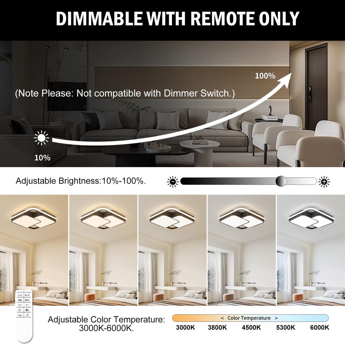 Q: What are the brightness and color temperature options for the ORANOOR LED ceiling light?A: The ORANOOR Modern LED Ceiling Light features a dimmable brightness range of 10-100% and allows you to adjust the color temperature from 3000K to 6000K using the remote control.