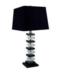 Not just elegant, this lamp complements many decor styles. Use near a bed or in a living room. The stacked crystal cubes are shaped in modern blocks and look great with the black finish. An uno style square shade sits atop this fashionable lamp. Crystal cubed construction.