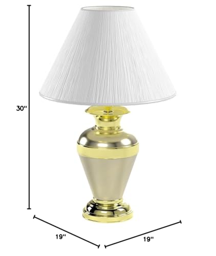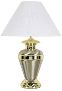 Ore International, Inc. is a wholesaler who imports Lamps, Gifts and Furniture. Our mission is to be the leading provider of innovative, high quality lighting fixtures, gift and furniture to world-wide commercial, industrial, residential and utility markets. Ore International Inc. has a total commitment to a Customer-First attitude and to being consistently superior to competitors in fulfilling customer needs. Ore International is also committed to growing profitably and to the opportunity for all employees to contribute, grow, have fun and take pride in their work. This Metal Lamp in Satin Nickel is the perfect way to add a touch of elegance and beauty to your home. This table lamp has an urn-shaped ceramic and aluminum base. Requires a 3-wa 60 watt max type A bulb (not included). The linen shade features pleating and a gold trim for added charm. UL listed. Shade dimensions are 19 x 19 x 11.5 inches. Nylon shade has a paper lining for added durability. Lamp measures 19 x 19 x 30 inches.
