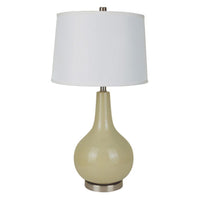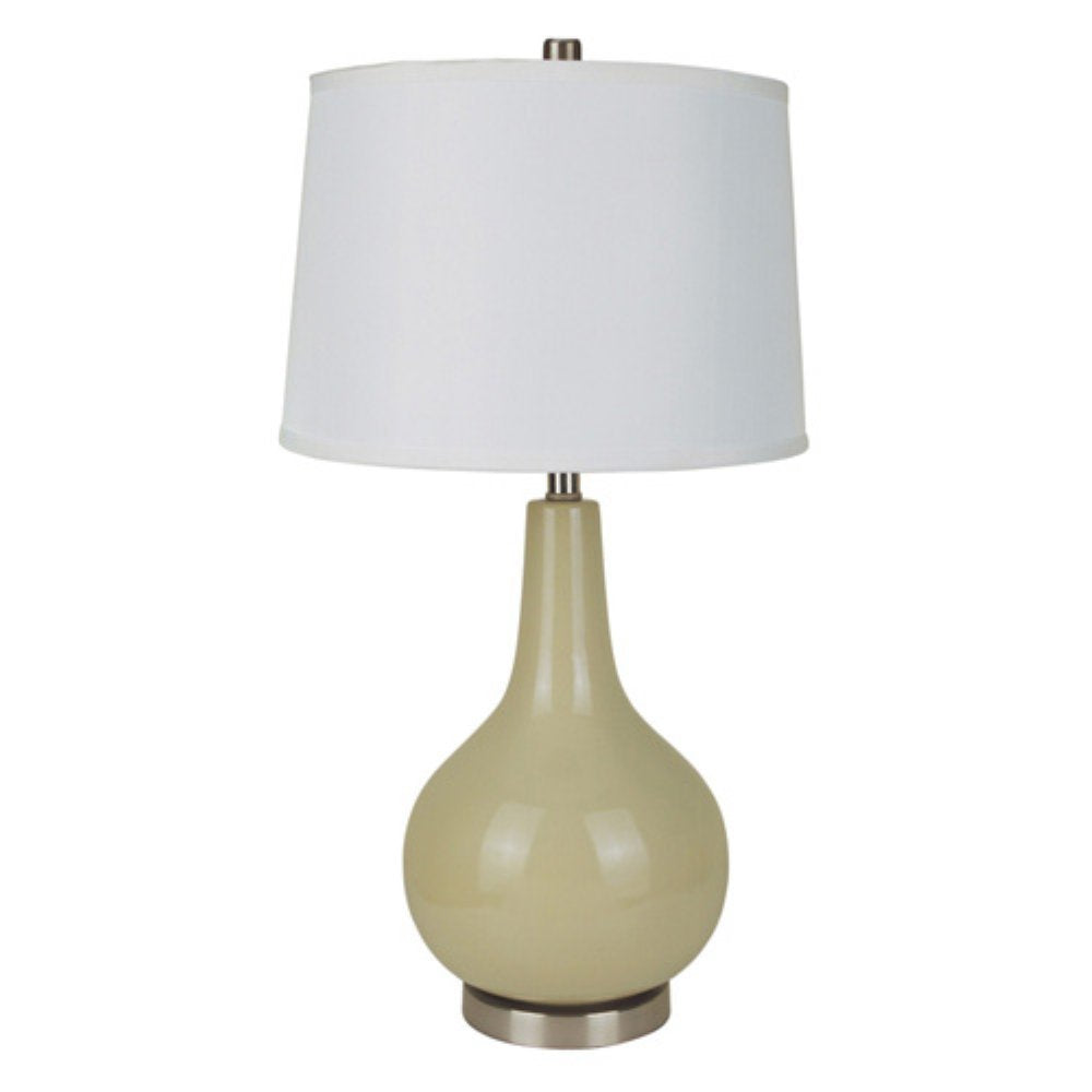 Hand fired ceramic table lamp body in a beige glaze has a great contemporary look. Ideal for bedside tables, buffets and side tables. A white linen shade adds to the appeal of the beige ceramic body. Takes one 150 watt three way bulb.