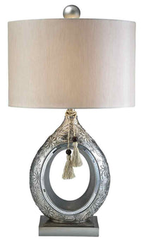 Q: What materials are used in the construction of this table lamp?A: This beautiful table lamp is crafted from resin, featuring a soft silver base with a lovely oval oatmeal-colored shade.