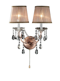 Ore International is a leading provider of innovative, high quality lighting fixtures, gift and furniture for the consumer market. Elegant design, great value and prompt service are hallmarks of Ore International. This elegant wall sconce will give the room a luxurious feel with the gold toned body and pink colored lampshades. The steel body has a golden finish that looks brilliant with the glimmer from the hanging faux crystals. The two drum style fabric lampshades are a blend of brown and pink tints for a sophisticated look. Uses two 40-Watt bulbs, some assembly required. Sconce measures 15-Inch x 7-Inch x 17.5-Inch and weighs 3-Pound. Lampshades measure 7-Inch x 5.5-Inch x 6-Inch. Clean lamp with a dry cloth. Made in China.