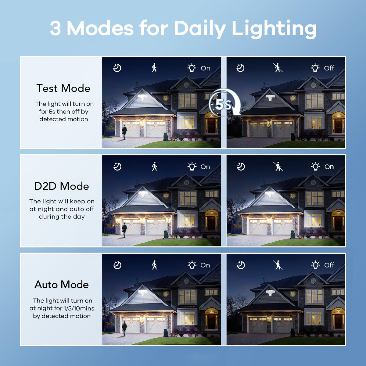 Q: What are the different modes available for the OREiN 4500LM Flood Light?A: The OREiN 4500LM Flood Light offers three modes: TEST Mode, which activates the light for 5 seconds when motion is detected for testing; AUTO Mode, which turns on the light at night when motion is detected with adjustable timing (1, 5, or 10 minutes) and distance (10ft to 40ft); and D2D Mode, which automatically turns on at dusk and off at dawn.