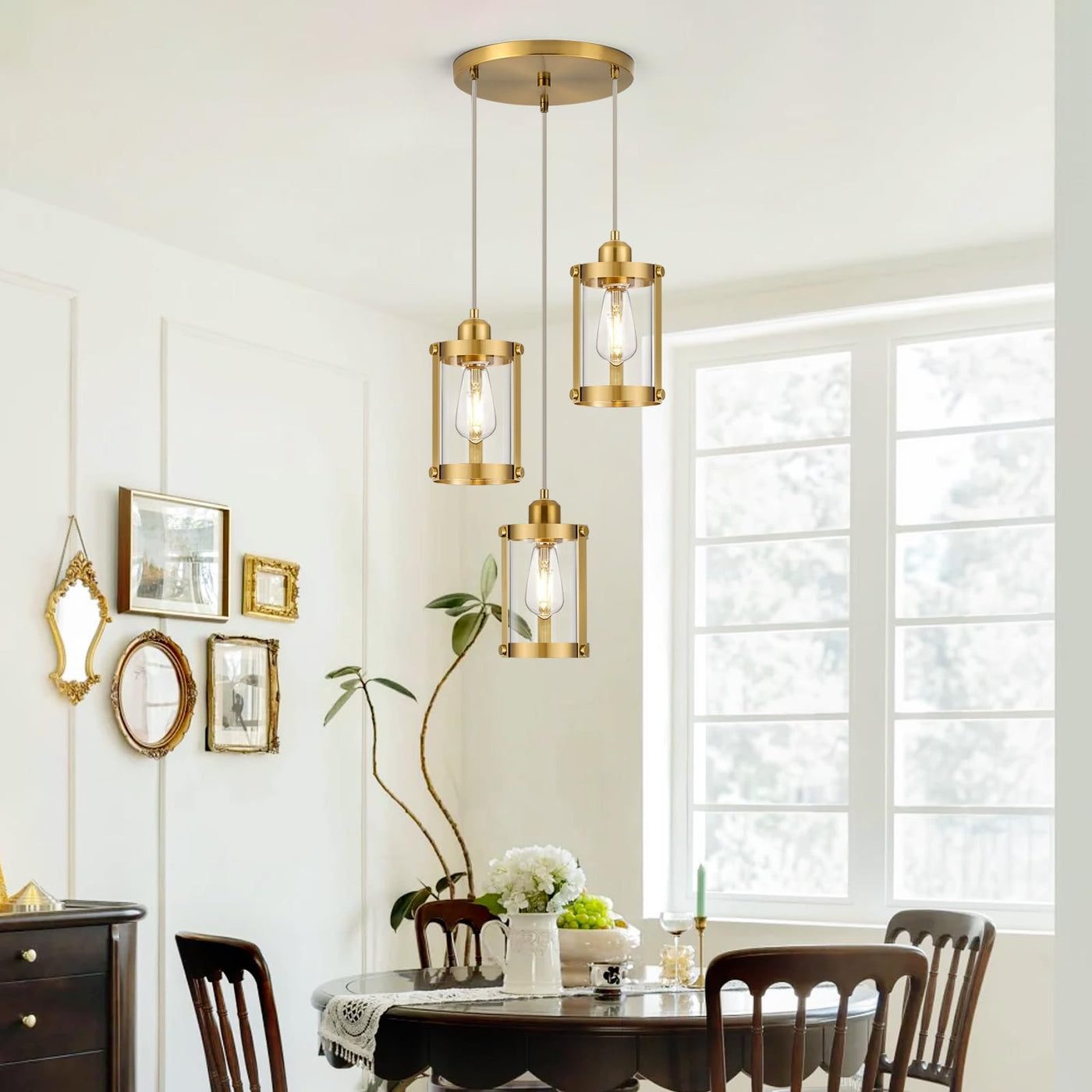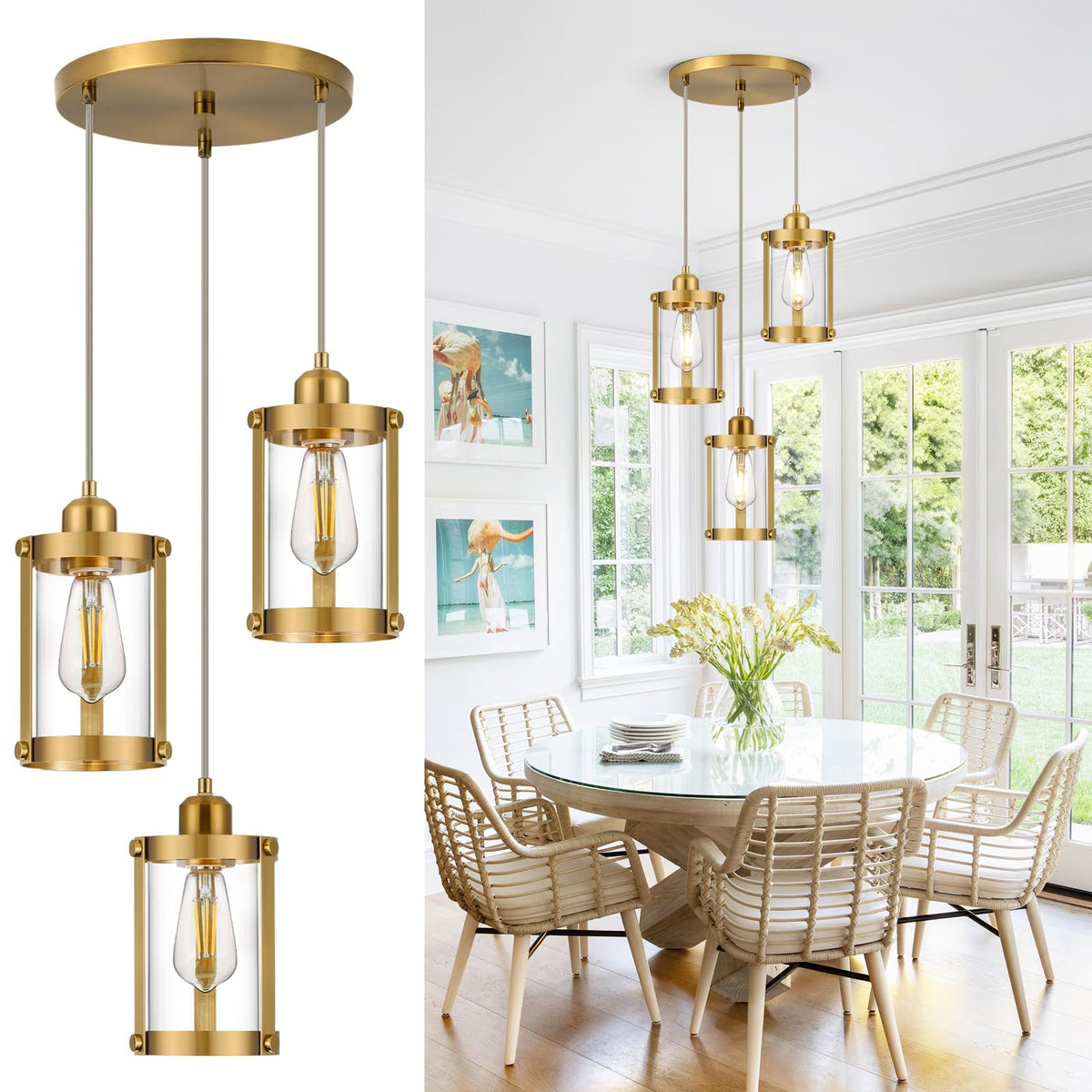 Q: What materials are used in the Osimir 3-Light Pendant Lighting?A: The Osimir 3-Light Pendant Lighting is crafted with a metal outer layer featuring a brushed gold finish, complemented by a cylinder glass inner layer. This combination not only ensures durability but also adds an elegant touch to your home decor.