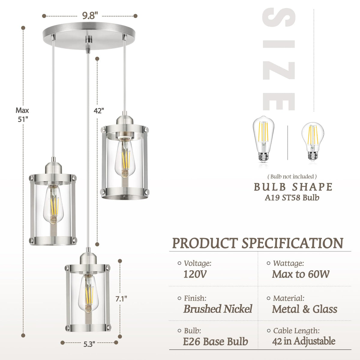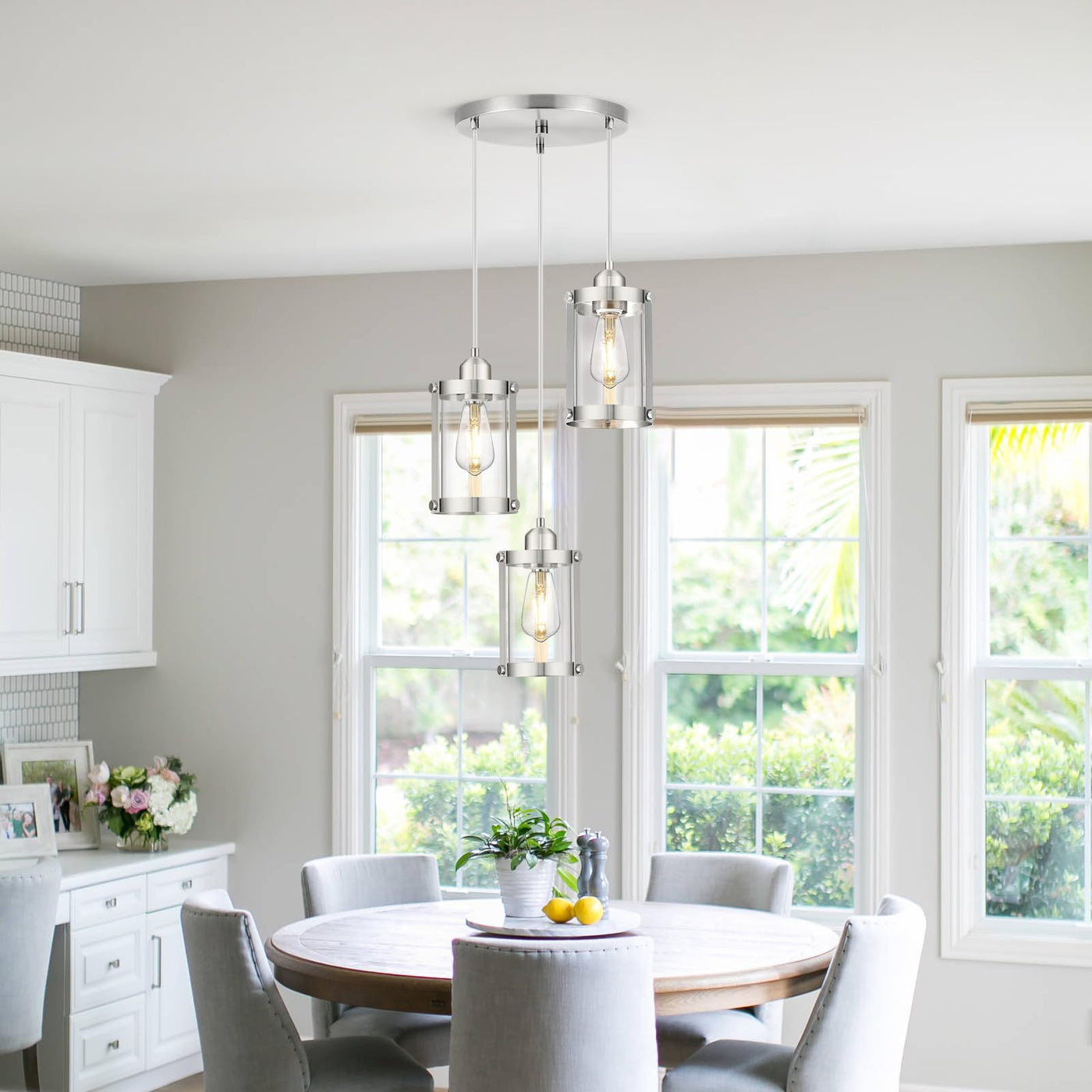 Osimir 3-Light Pendant Lighting, Brushed Nickel Dining Room Chandelier Light Fixture Over Table With Clear Glass, Modern Cluster
