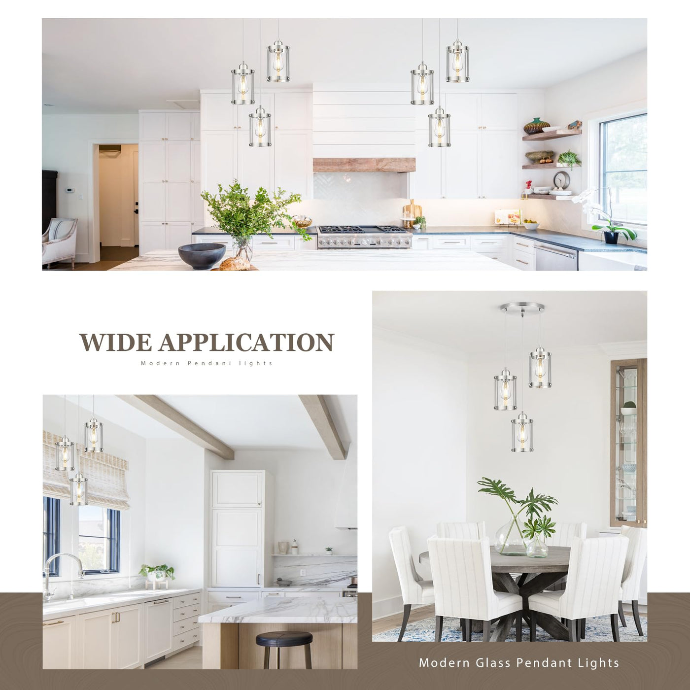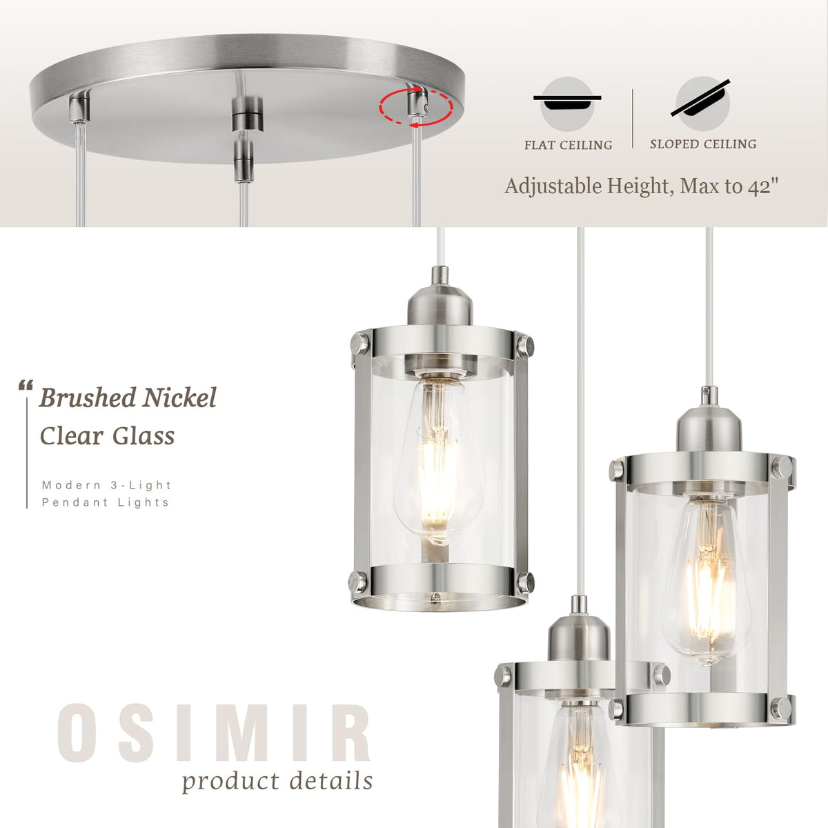 Q: What is the style of the Osimir 3-Light Pendant Lighting?A: The Osimir 3-Light Pendant Lighting features a modern minimalist style, with a brushed nickel finish and a double-layer design incorporating cylinder glass. This elegant design adds a luxurious touch to any room.
