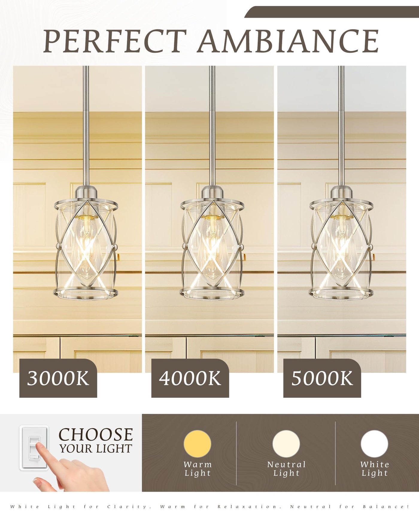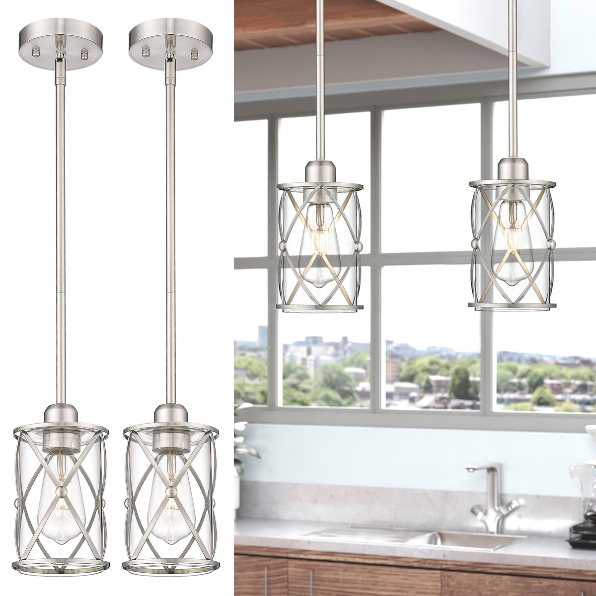 Q: What is the design style of the Osimir pendant lights?A: These pendant lights feature a modern industrial style with a brushed nickel finish and a clear glass shade. The X-frame design not only serves as functional lighting but also acts as an artistic decoration for your kitchen or dining area.
