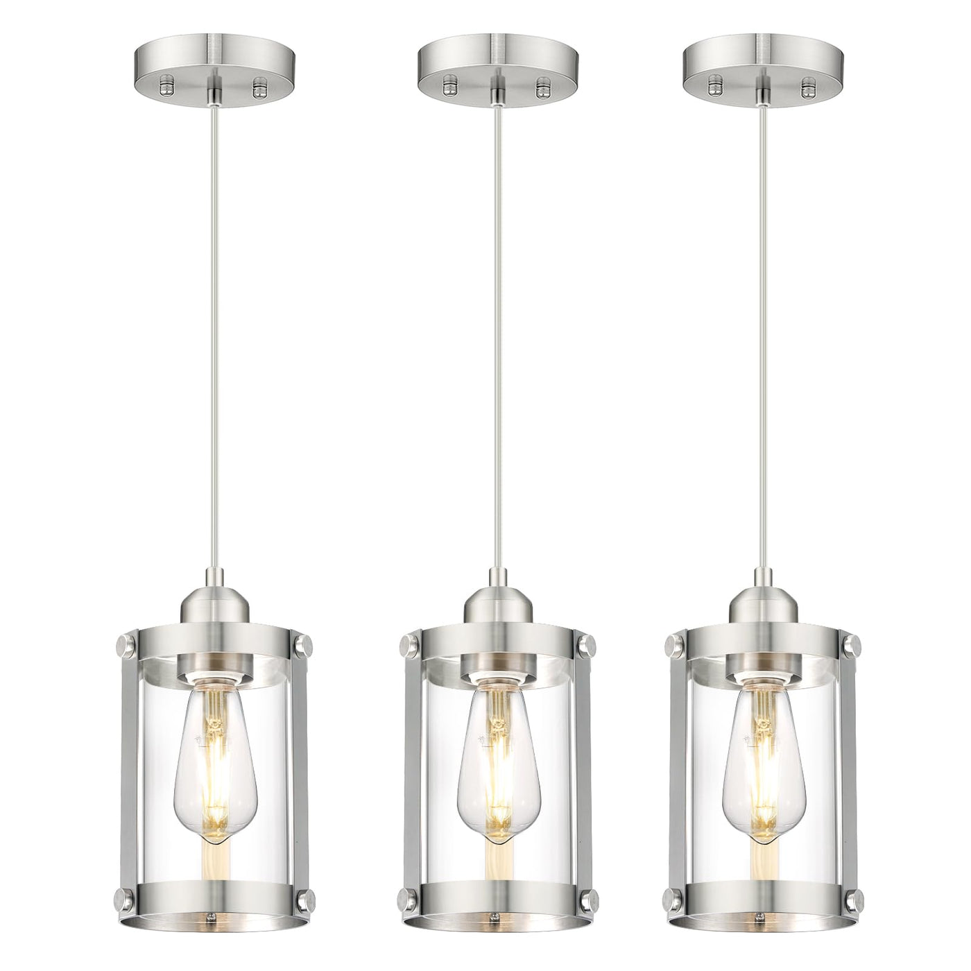 Q: What style do these pendant lights complement?A: The Osimir Brushed Nickel Pendant Lights feature a modern minimalist style with a brushed nickel finish and clear glass, making them an excellent choice for contemporary kitchen islands, dining rooms, and farmhouse decor. They serve not only as functional lighting but also as an artistic decoration.